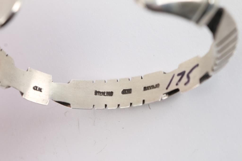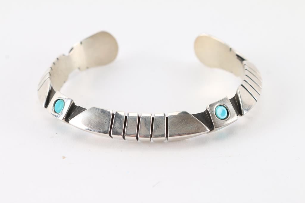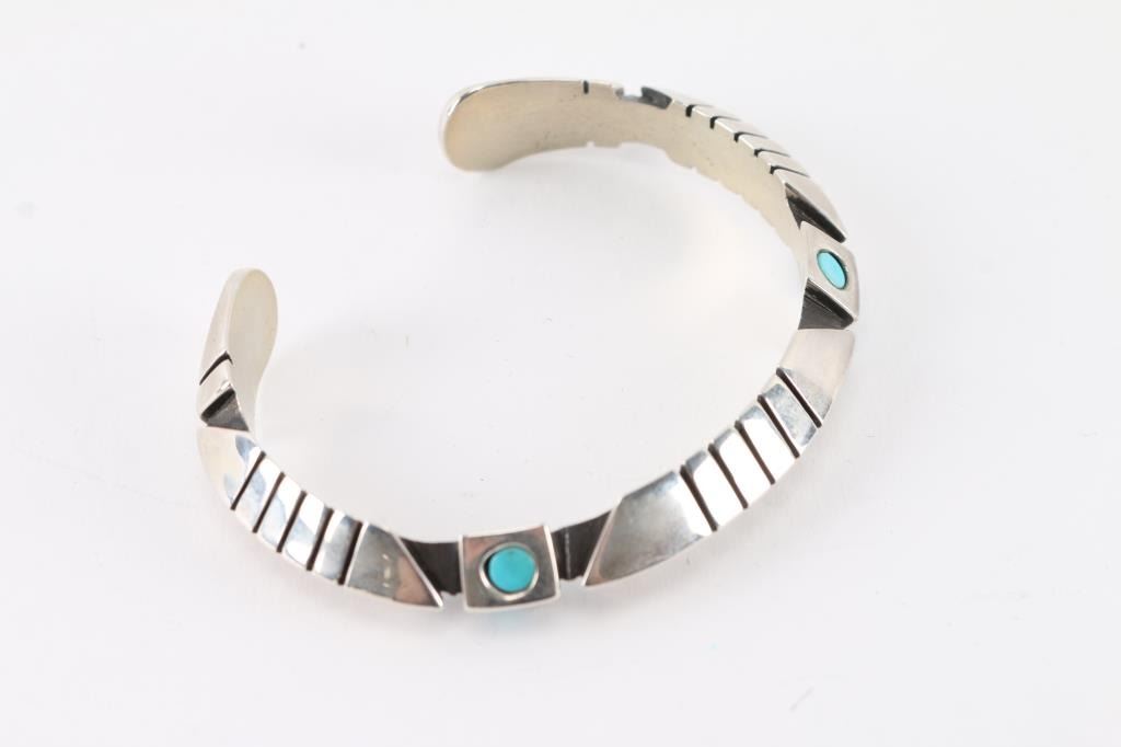 Modern design with 4 round turquoise stones. Measures 2" with gap. Maker's marked JM.