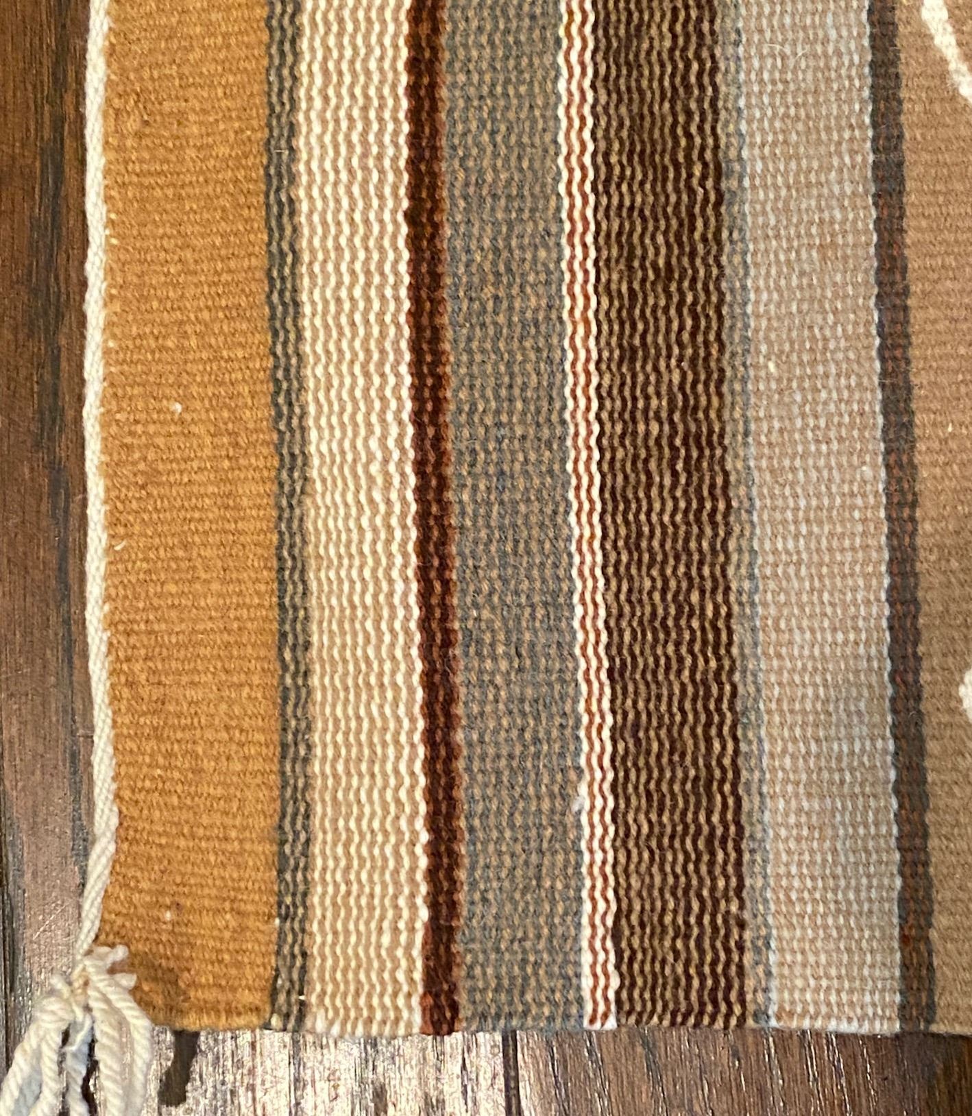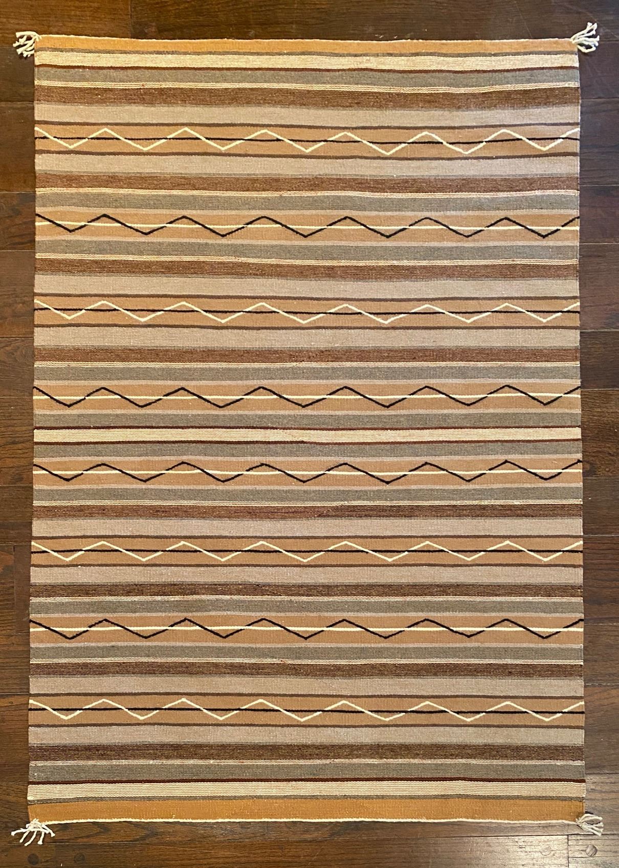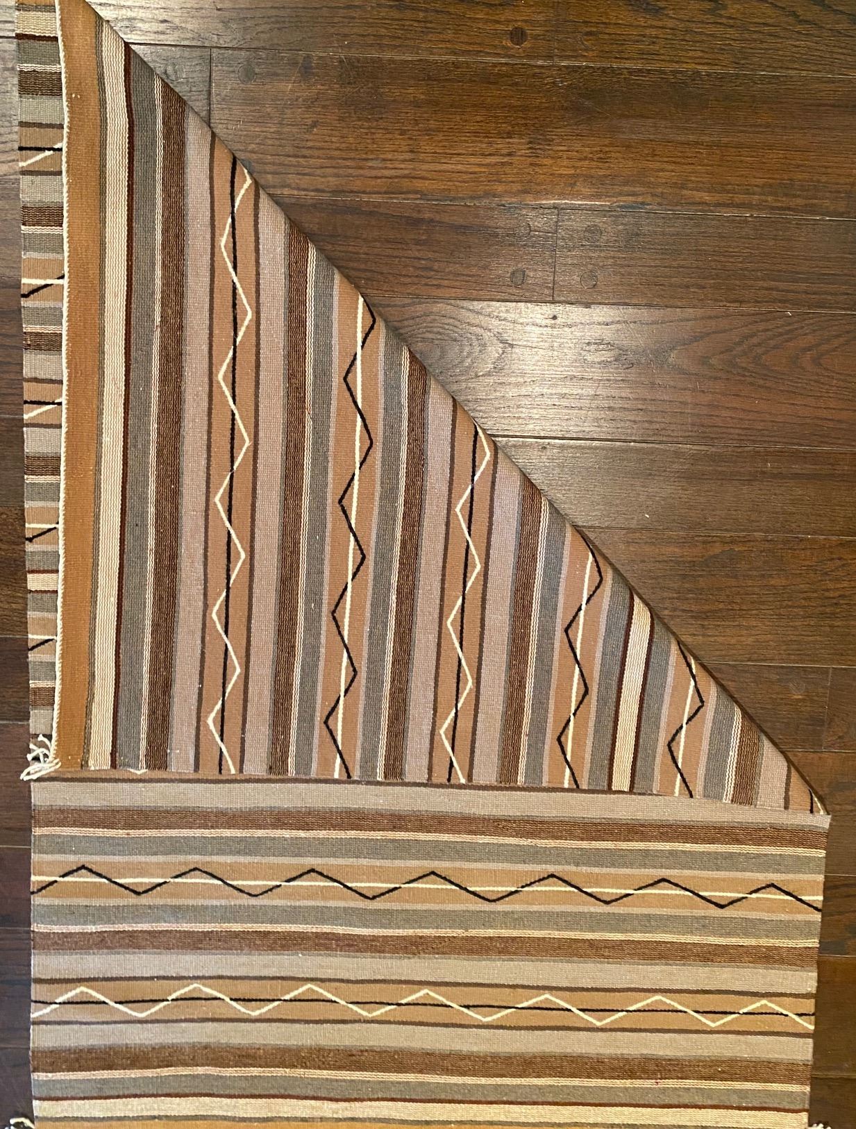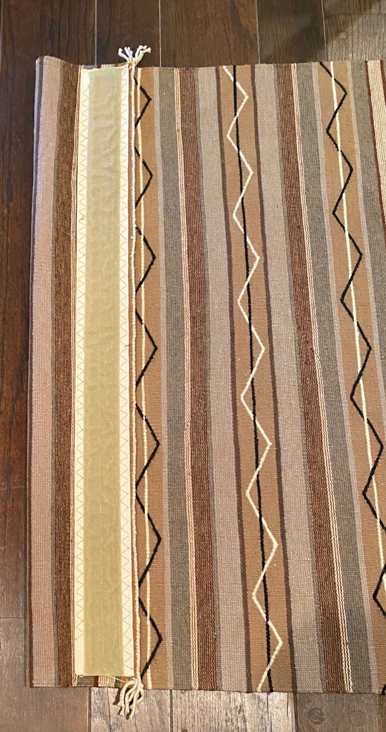 This is a nice Navajo Woven Chinle Style Weaving measuring 54-inches by 37-inches. It does have the stripe Museum Hanging System on it. Can be removed but makes a nice way to display weavings.