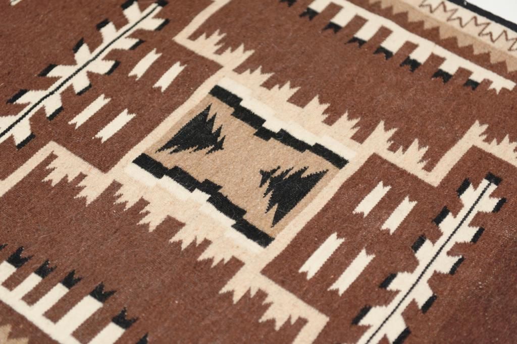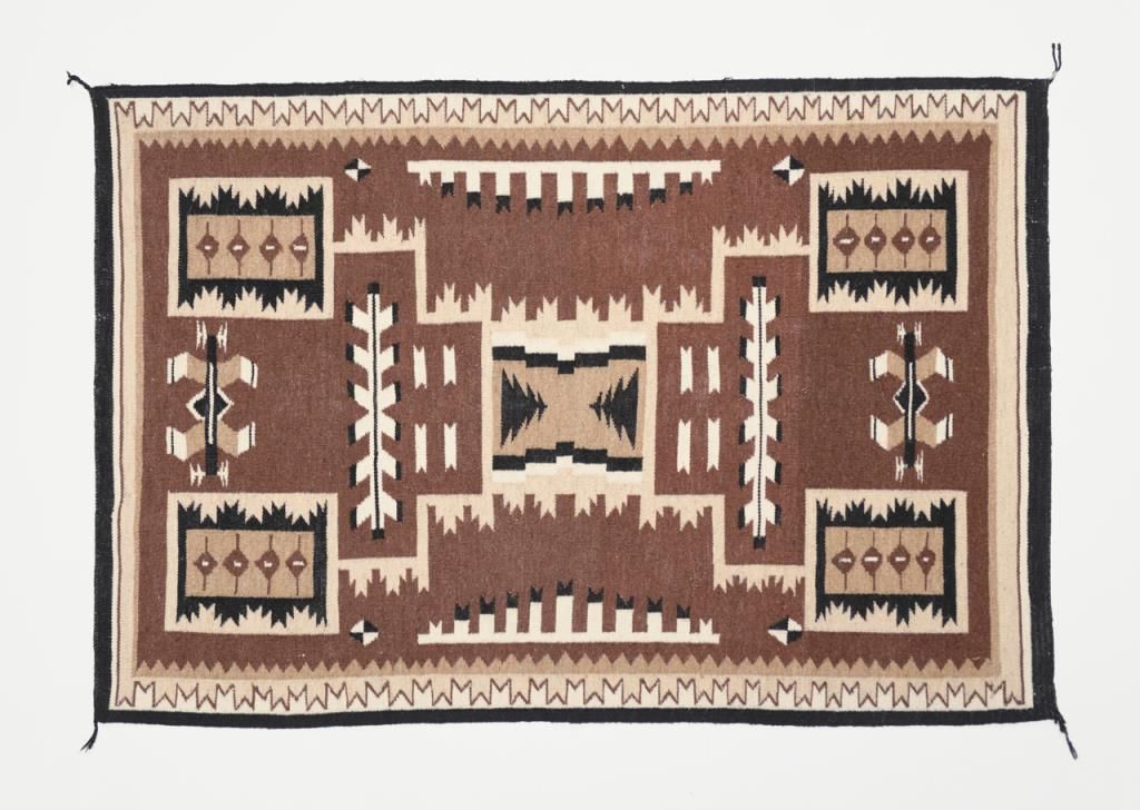 Beautiful Navajo storm pattern tightly woven tapestry, approx. 50” x 34” in minty condition; classic brown, tan, cream, white and black colors, approx. 30-50 years old. Est.: $600-$1,200.