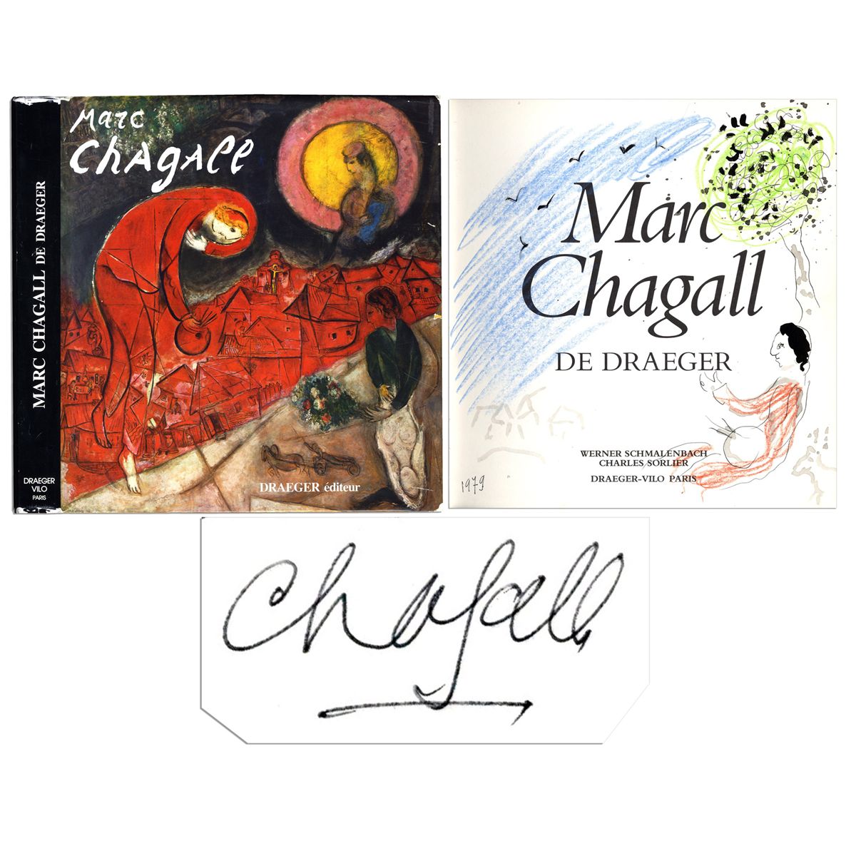 Original art hand-rendered and signed by Marc Chagall on the frontispiece of his book ''Marc Chagall de Draeger,'' published by Draeger-Vilo: Paris: 1979. The great modernist employs wax crayon, pen, brush and India ink to execute a work directly onto the frontispiece. He inscribes the page opposite: ''Pour Ingrid et Alfred en bon souvenir Chagall''. Dated 1979 to the lower left. The drawing's stark black birds alighting in the tree provide a quintessential example of Chagall's use of color to create movement in a piece. Measures 11.75'' x 11''. Near fine. With provenance from Christie's. Recently sold for $19,725 as lot 103 in Christie's 10 February 2012 sale.