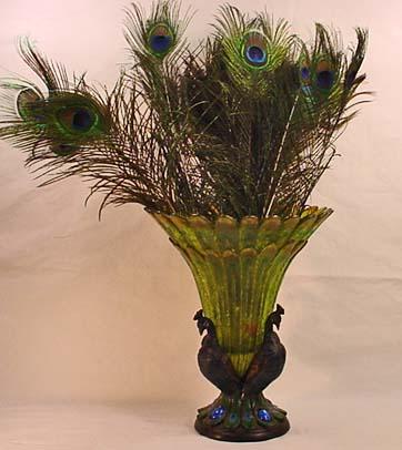 Beautiful Peacock Vase W/ Feathers - Approx. 10" Diameter By 13" Tall