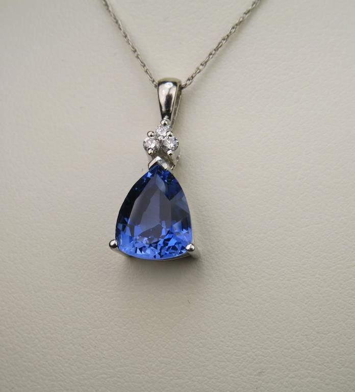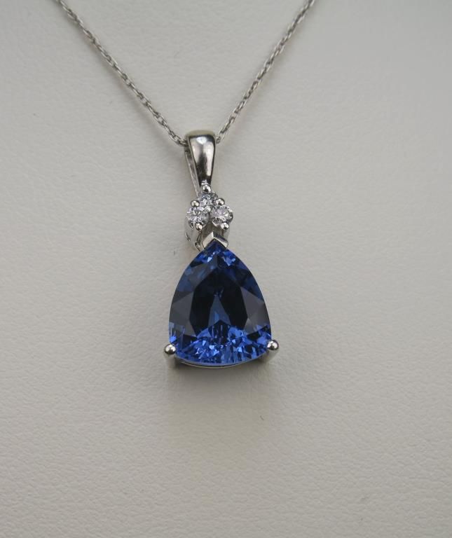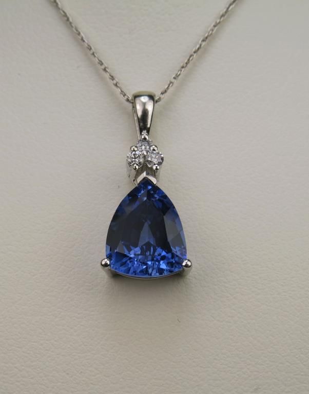 Beautiful Pear shaped created ‘Ceylon’ Color Blue Sapphire weighing approx. 3.00 carats accented with 3 Diamonds set in 10 karat white gold. Estimate $400-$600