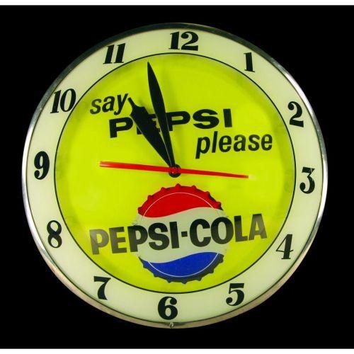 Pepsi Cola Clock made by Advertising products out of Cincinnati, OH., solid background. Excellent working condition. 15 inch diameter.