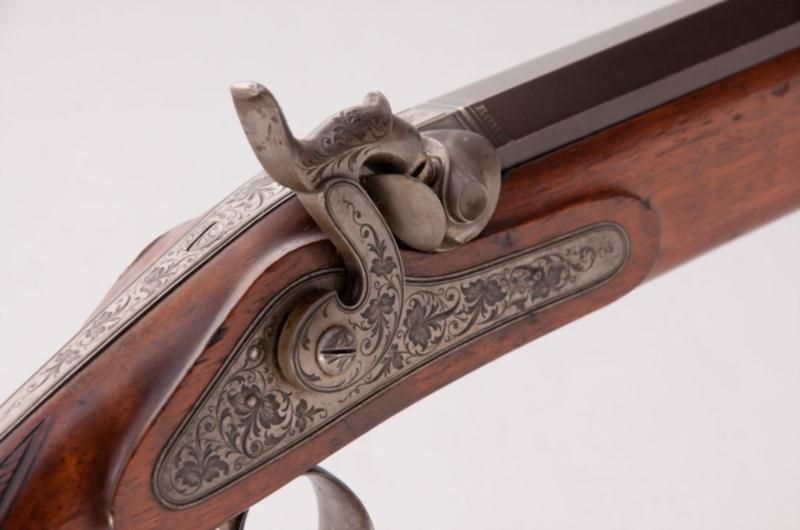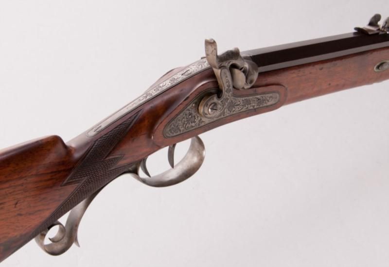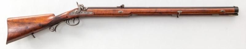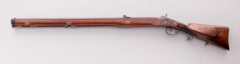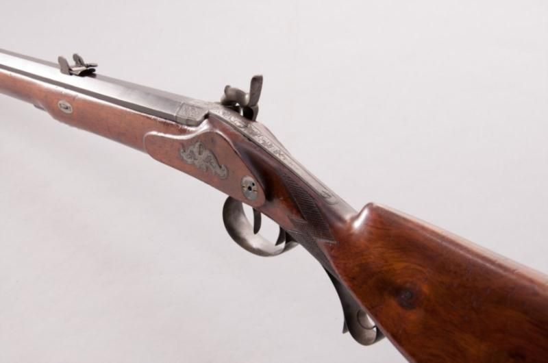 Beautiful Percussion Jaeger Rifle, marked ''Guss Stahl Rohr'', NVSN, .50 cal., 30'' blue octagon barrel inlaid with platina band marked ''Guss Stahl Rohr'', light vignette engraved lockplate, hammer, tang, escutcheon, triggerguard and buttplate; full European walnut stock with horn end cap. Period adjustable rear sight and post front sight, adjustable set trigger, and circular blue escutcheon to left side above triggers probably for additional sighting device. Condition is excellent retaining approx. 97% thinning and lightly toning blue to barrel. Light discoloration to bright parts from accumulated age. Well-defined checkering at wrist with very minor marks to stock. Action is crisp and functioning, barrel with well-defined lands in grooves.