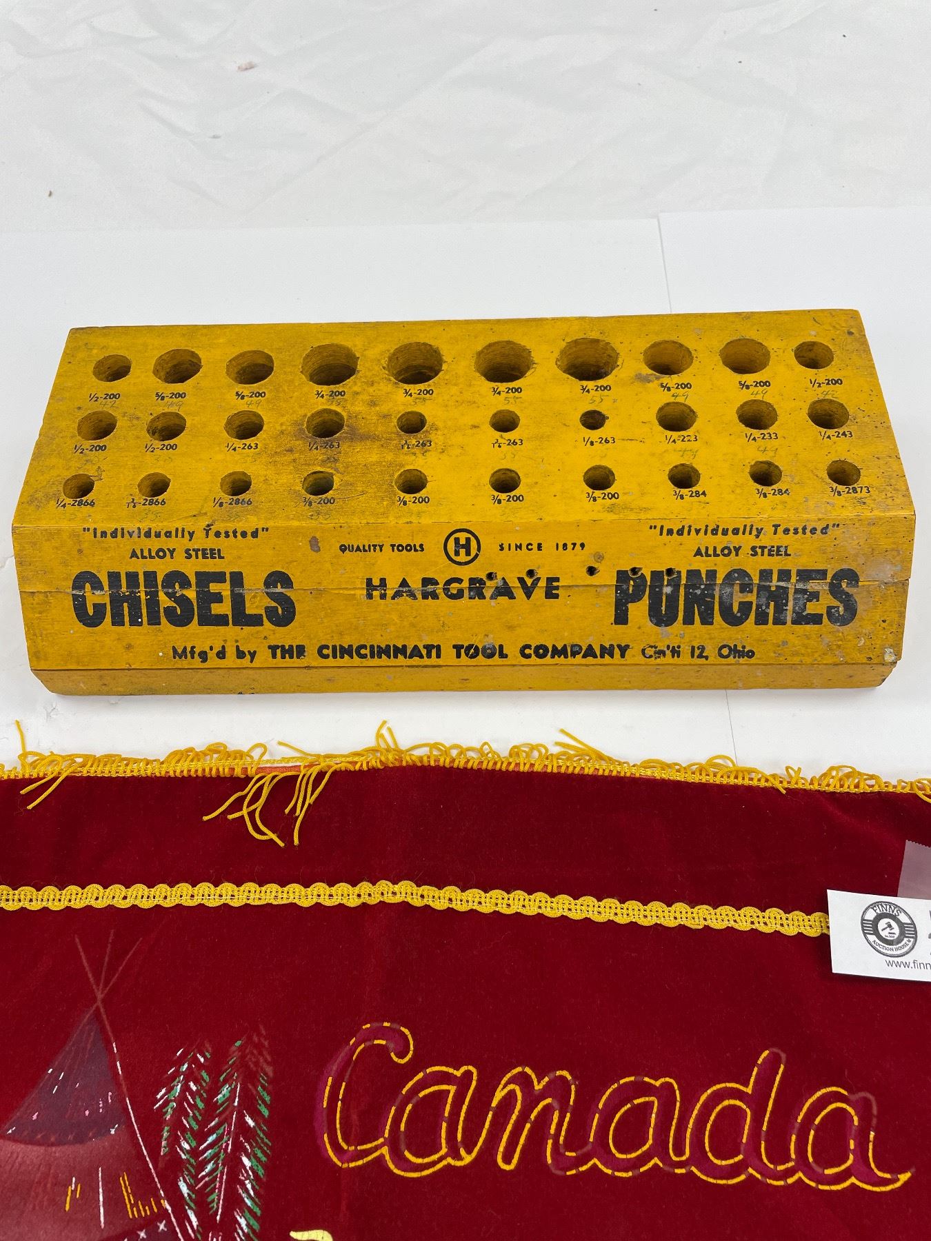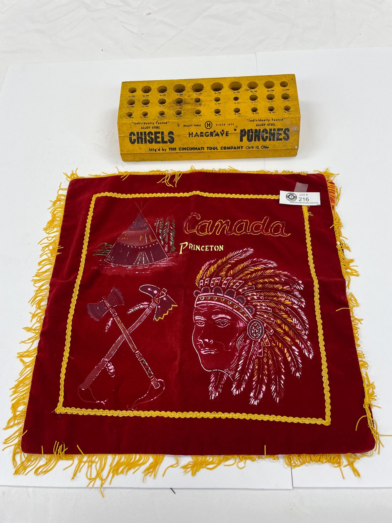 Beautiful Princeton Cloth Banner with Indian Head and Wooden Chisels and Punches Display Great Advertising Piece
