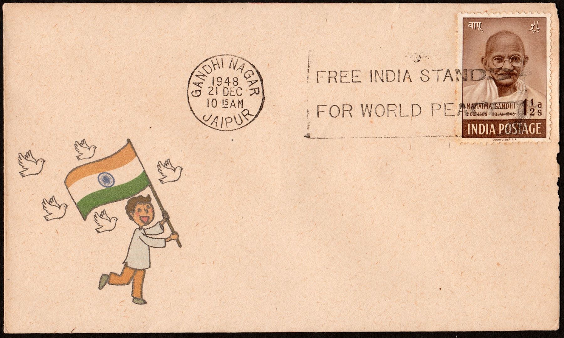 Private Cover, 1948, Gandhi Stamp of value 1 ½ Annas, cancelled with a slogan as “FREE INDIA STANDING | FOR WORLD PEACE”, round seal as “GANDHI NAGAR | 1948 | 21 DEC | 10 15 AM | JAIPUR”, On the front there is an adorable image of a child proudly and happily holding Indian national flag and some birds around him, excellent condition, Rare.
