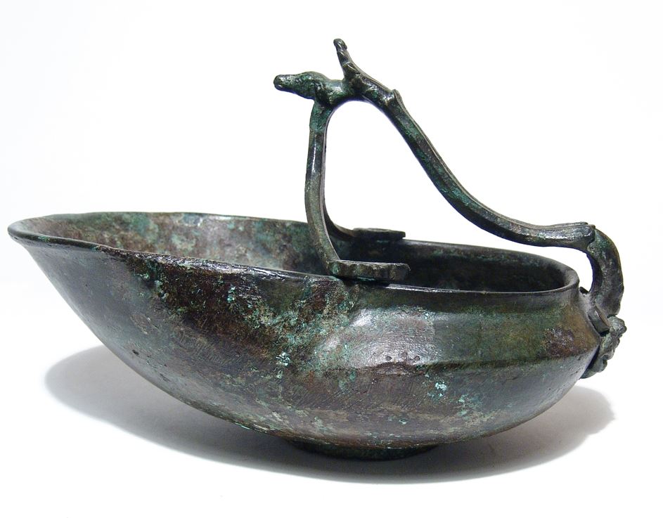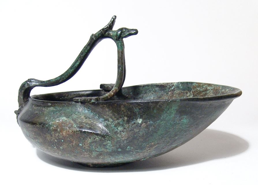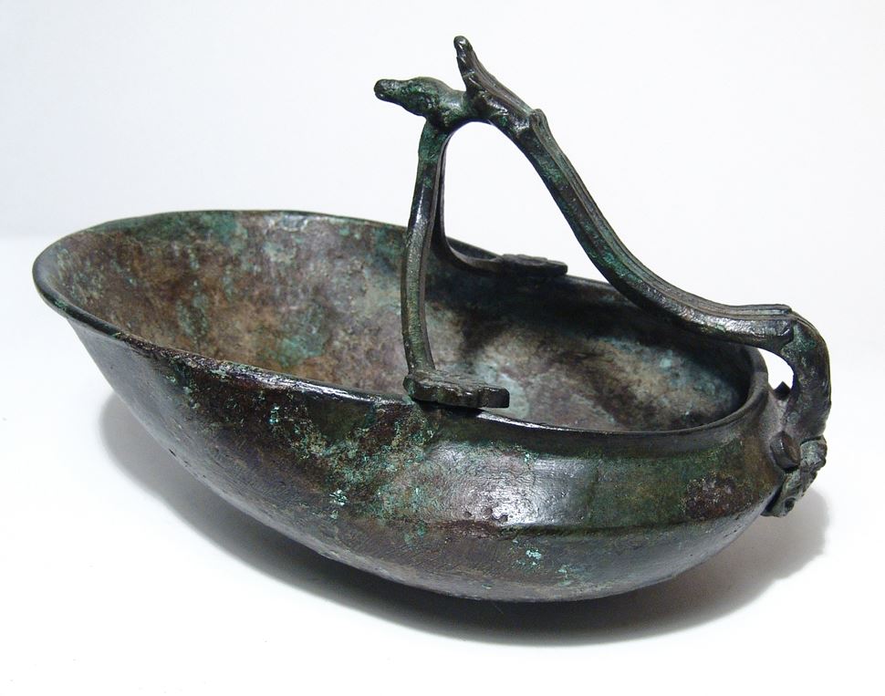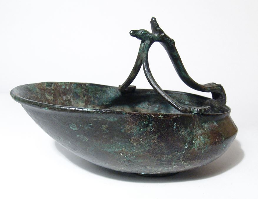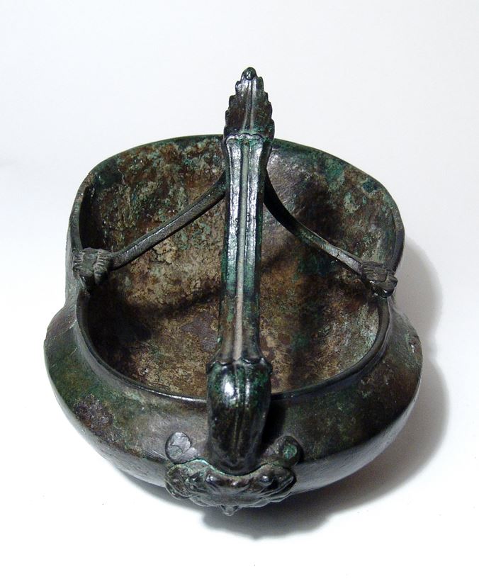A beautiful Roman bronze serving vessel, c. 1st - 2nd Century AD, with wide, curved pouring spout, the handle attaching at three points and decorated with floral devices, the central portion in the form of a stylized acanthus leaf with a canine head at top. The back of the handle is decorated with the wide face of a young satyr, indicating this could be a serving vessel for wine. At the bottom is a disc base decorated with turned concentric grooves. A marvelous piece with attractive glossy green-brown patination. 8 1/2 in x 5 1/2 in x 5 1/2 in (21.5 x 14 x 14cm). Purchased in the 1970's from Mr. Hoyt B. DeShields, JR of Decatur, MD