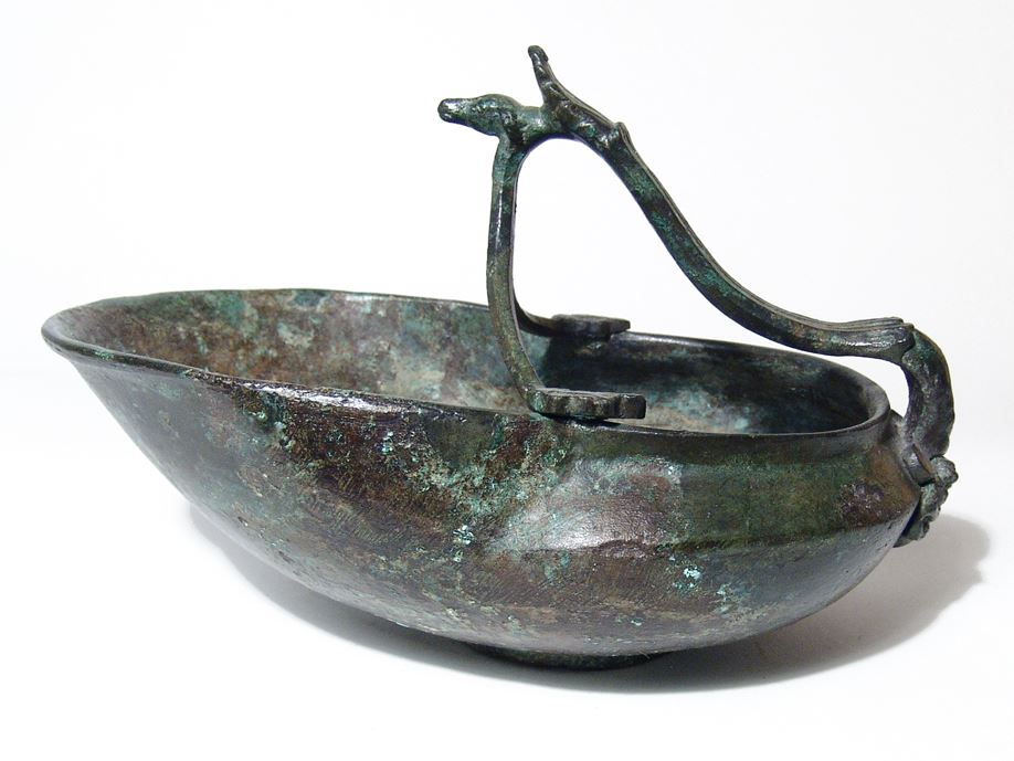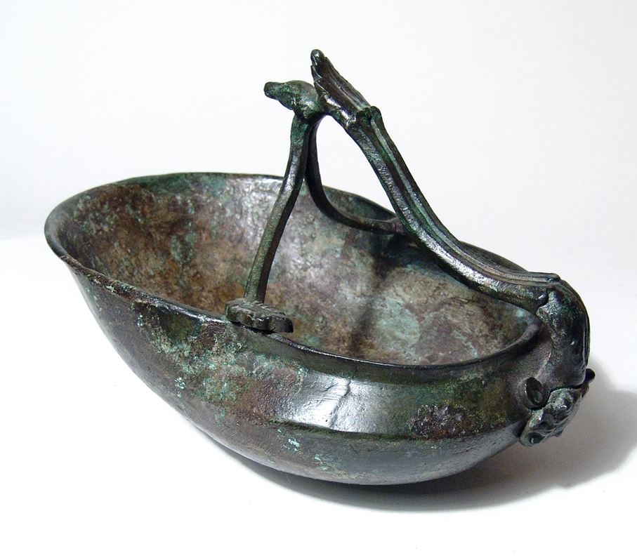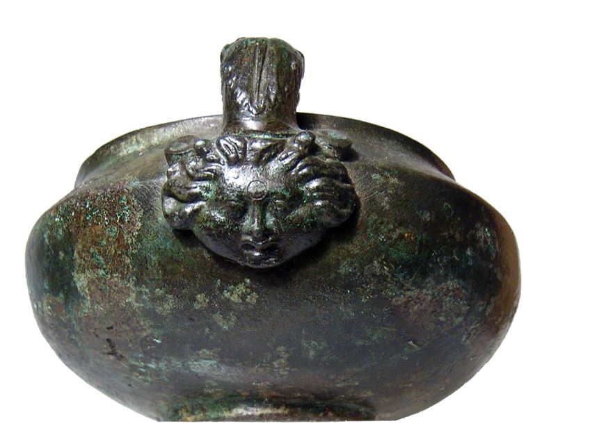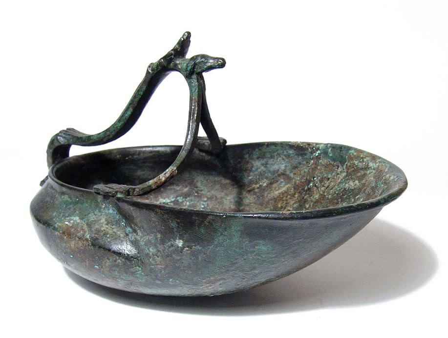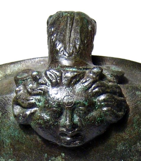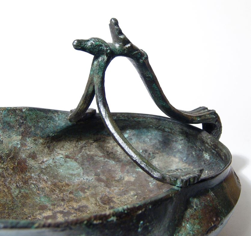 A beautiful Roman bronze serving vessel, c. 1st - 2nd Century AD, with wide, curved pouring spout, the handle attaching at three points and decorated with floral devices, the central portion in the form of a stylized acanthus leaf with a canine head at top. The back of the handle is decorated with the wide face of a young satyr, indicating this could be a serving vessel for wine. At the bottom is a disc base decorated with turned concentric grooves. A marvelous piece with attractive glossy green-brown patination. 8 1/2 in x 5 1/2 in x 5 1/2 in (21.5 x 14 x 14cm). Purchased in the 1970's from Mr. Hoyt B. DeShields, JR of Decatur, MD