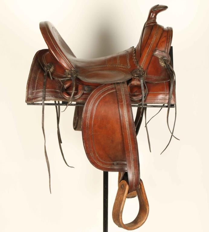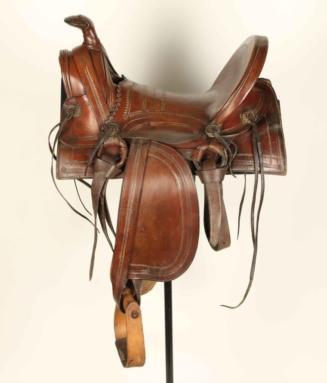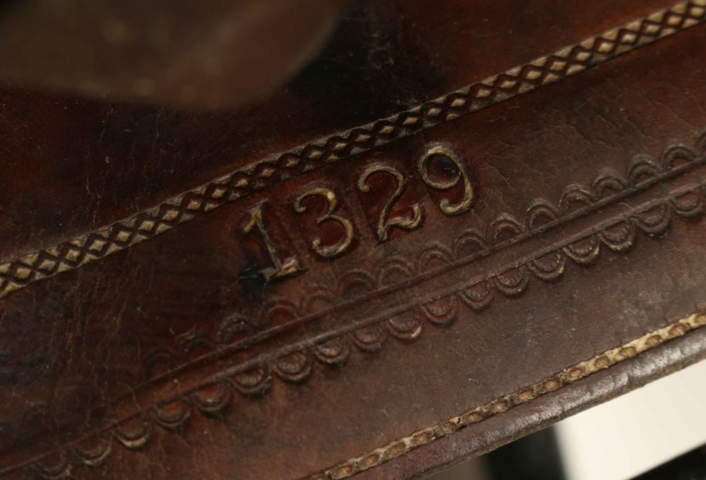 Brown leather with geometric and floral motif, square skirt, unmarked with wood stirrups. Very good condition. Seat measures 14".