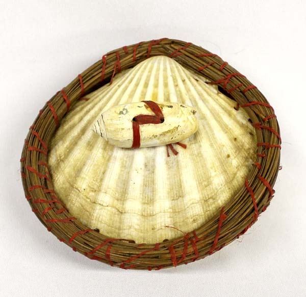Beautiful Native American Seminole Double Scallop Shell Pine Needle Basket, measures 3.5'' x 6.5'' and is double sided, the top features a scallop shell with an olive shell finial while the bottom features a scallop shell, the middle of the piece is pine needle basketry, very unique piece
