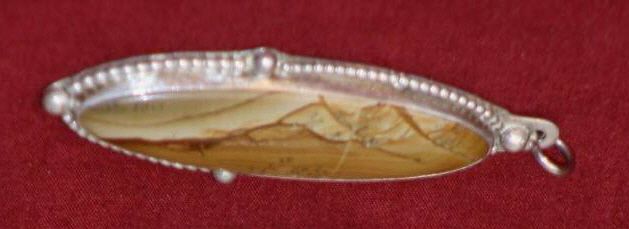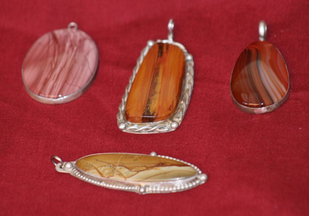 Beautiful Set of 4 Stone And Silver Pendants; Set of 4 Stone And Silver Pendants; Picture Jasper and Silver Pendant, Nice Scenic Landscape in the Tan and Browns of the Jasper, Silver Pendant, 20mm x 60mm. Jasper and SilverPendant, Made of Pinkish Picture Jasper, 30mm x 45mm. Petrified Wood and Silver Pendant, Made of Colorado Petrified Wood. 27mm x 55mm. Brazillian and Silver Pendant, 35mm x 22mm,