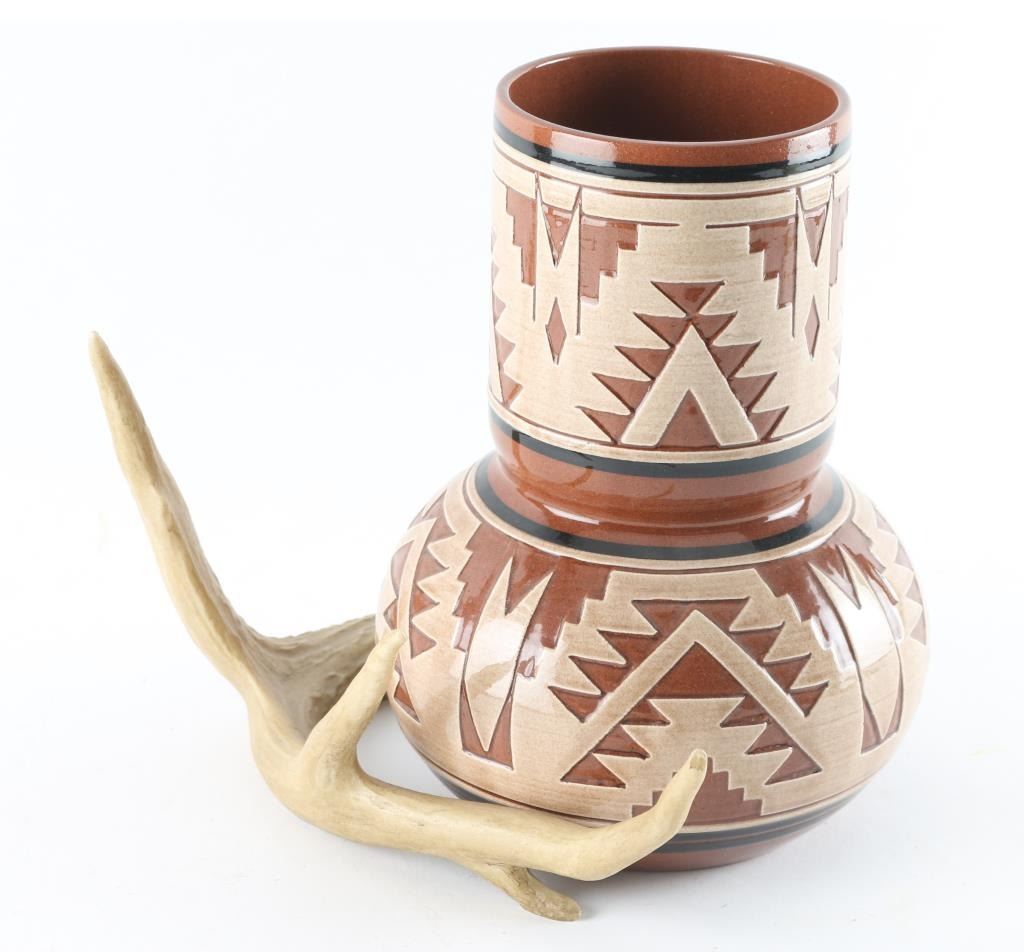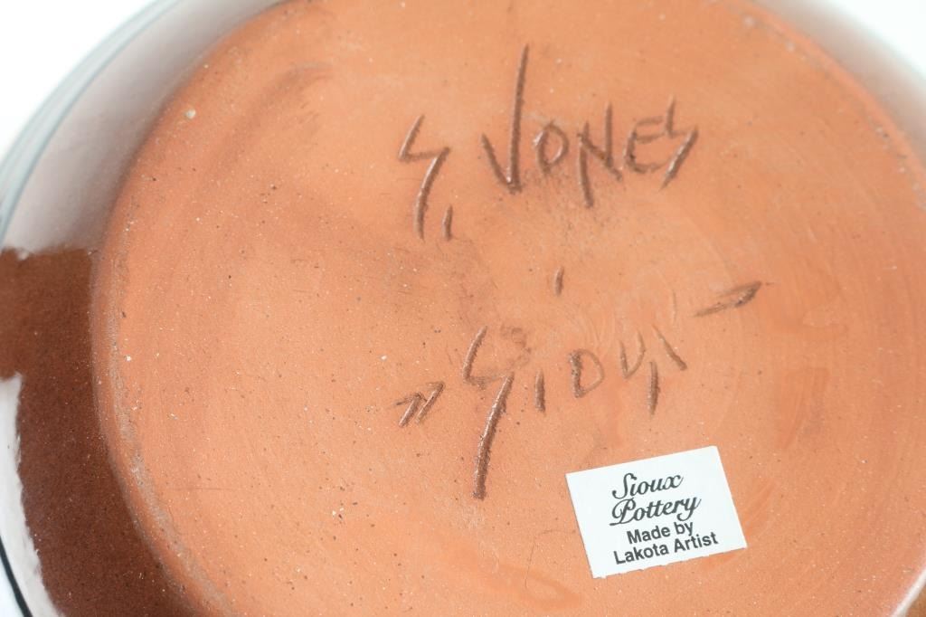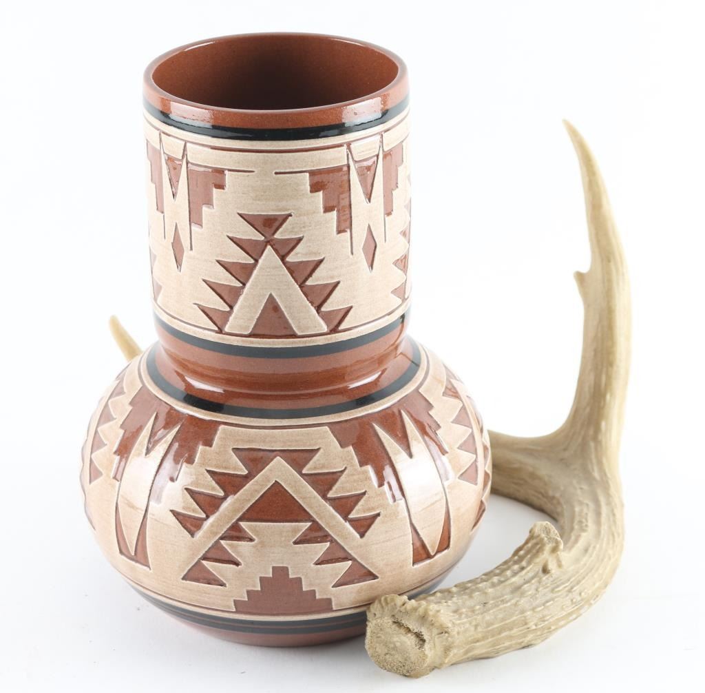 Made by "Lakota artist" "S.Vones" signed on bottom of vase with geometric design in good+ condition. Measures 4.5inches at rim and 8.5 inches long.