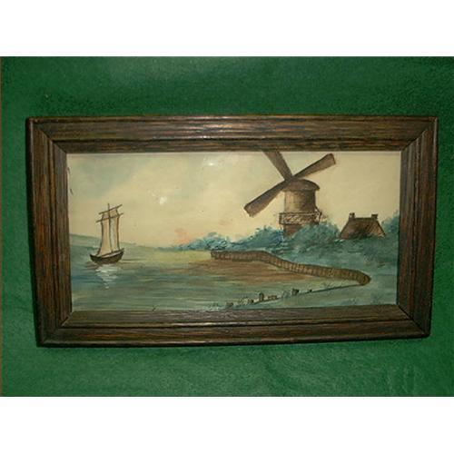 This is a real nice small water color of a windmill on a shore line with a boat. Its signed in the lower right hand bottom "Hazel Goethite" Or {"Hazel Gzethvit"} Hope I spelled it right. Its has a beautiful little frame and its 9 1/2" W X 5 1/2" L. Picture is 8" L X 3 3/4" W. Very colorful one and it looks great on any wall. Great gift item and nice add to any collection you may have. Enjoy.