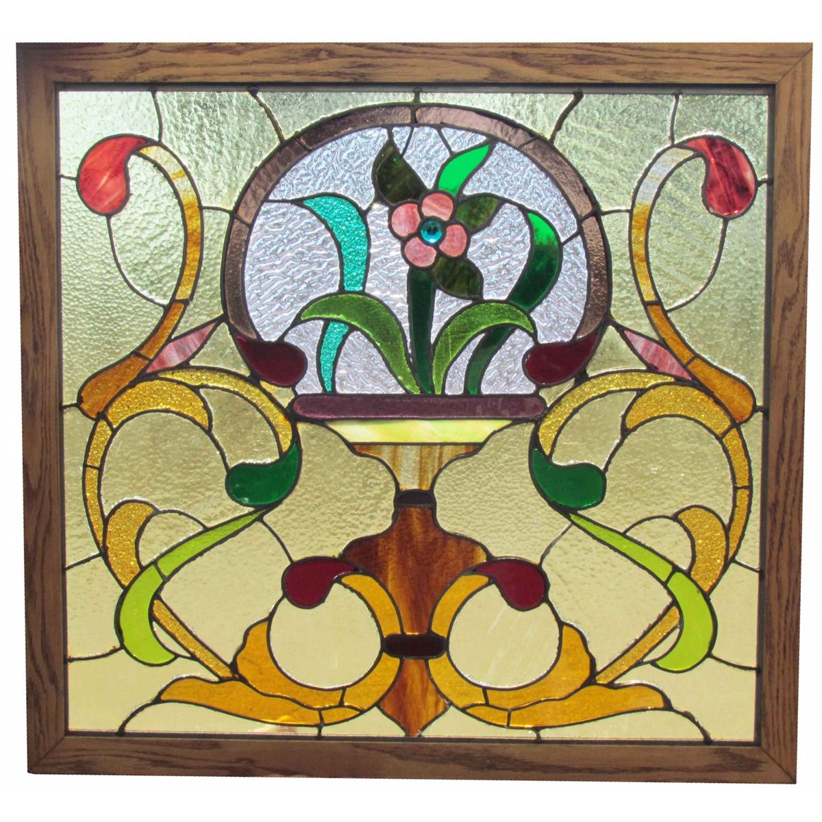 Beautiful Stained - Leaded Glass Window. Jewel on the top of the vase. 28 3/4 X 27 1/8 inches.