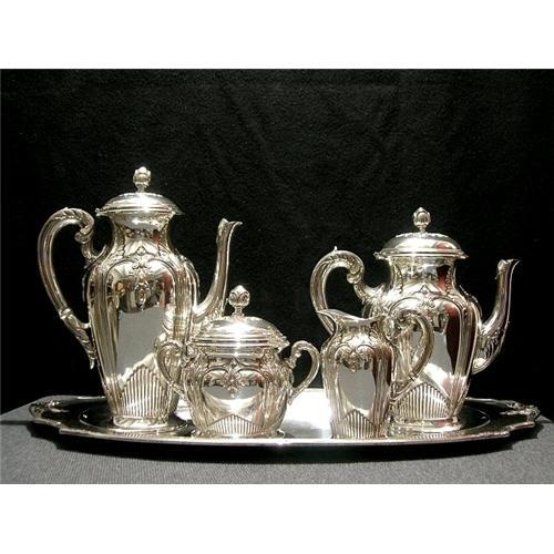 The Tray has the Silverplated wasted, you can see the yellow metal (Bronze). The Coffee Pot the hang is with a little dent.