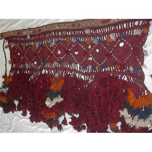 This is a semi antique kilim made horse trapping band from Turkomanistan....Band is hand woven kilim with woven net inc. very bushy wool tassels....decorated with beads and shells....Motifs on the kilim band done using warp replacement tapestry.....Size:- Band is 65" x 2.25" wide + 11" end strings, woven net is 44" x 28" deep + Tassels 13" long, many wool bushy tassels....cc 1970's, in exc. cond, washed, clean, no flaws... intact, untouched, original condition... SHI in Canada $20, to USA $25, International $30 not inc. insurance which is extra...Combined shipping available world wide ....Any Q or more photos please email us...Please bid if you're serious about buying this item, don't spoil it for others....We have the largest collection of Turkoman, Uzbeki, Afghan, Qashqaii, Bakhtiari, Shahsavan, Luri, Kurdi pieces in Canada. Thanks for looking at our listings....