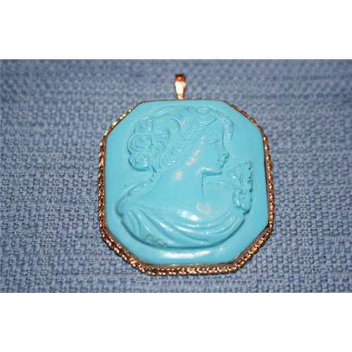<table width="100%" border="0" cellspacing="0" cellpadding="4"><tr><td><em> Unique and beautiful Cameo- I've never seen a turquoise cameo this fine!!</em></td></tr><tr> <td width="100%"> This is the unique Cameo you've been looking for!! Pristine Estate piece of clear blue turquoise, intricately carved, in excellent condition. Weighs 8.9 grams. A true collector's piece! </td></tr><tr> <td> </td></tr><tr> <td>Reference #: P75</td></tr><tr><td>Condition:Excellent</td></tr><tr><td>Year:post 1940</td></tr><tr><td>Height:1.9</td></tr><tr><td>Width:1.6</td></tr><tr><td>Title:Beautiful Turquoise Cameo Mounted in 14K Gold</td></tr><tr><td>Materials:14K Yellow Gold, Turquoise</td></tr><tr><td>Location:Minneapolis, Minnesota</td></tr></table>