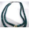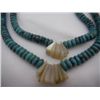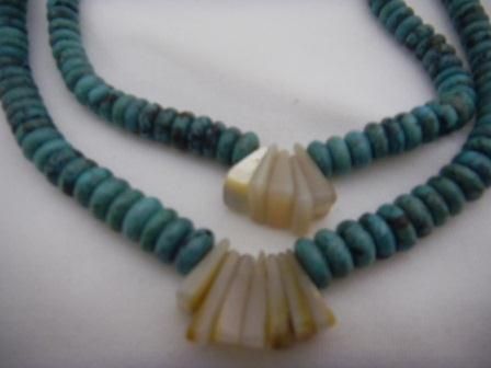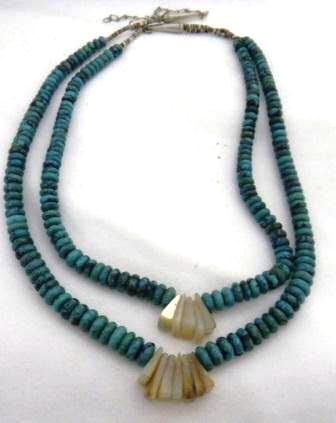 Double strand of graduated pieces of turquoise with necklace with carved shell drops at the center of each strand. The clasp of the necklace is sterling silver and between the claps are very tiny beads tiny heishi beads. Shipping $15.00. Very nice piece. Excellent Condition