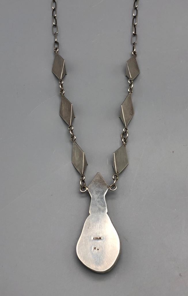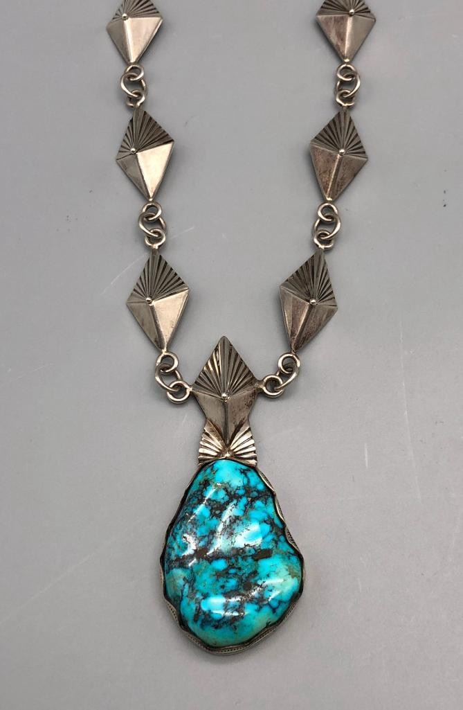 Offered for sale in this lot is a beautiful turquoise and sterling silver necklace with hollow-ware diamond shaped links. The pendant is set with a gorgeous piece of high grade turquoise in a great handmade, hand stamped bezel. Stamped as sterling. MAKER: Hallmarked MH. APPROX AGE: Fairly modern. SIZE: Fits a 20 inch neck. Pendant is 2-7/8 inches long X 1-1/4 inches wide. Weighs 61.4 grams. CONDITION: Good for its age, normal wear expected. Please look closely at the pictures as they are an important part of our description and are hereby incorporated into the description, specifically with regards to condition. SHIPPING: There will be a $5 handling / packaging fee for shipping this lot. The actual cost of postage will be added on top of that. BUY IT NOW: If you would like to buy this item now, without waiting for the auction day to bid on it, we do offer this option (which is available up to 48 hours before the actual auction starts). The “Buy it Now” price is the high estimate of this lot (plus applicable fees and the Buyer's premium is discounted to 10% when using the Buy it Now option). If you would like to exercise this option, you must contact us by email (or phone as long as you talk to someone live). Reference this lot number and your intention to "Buy it Now."