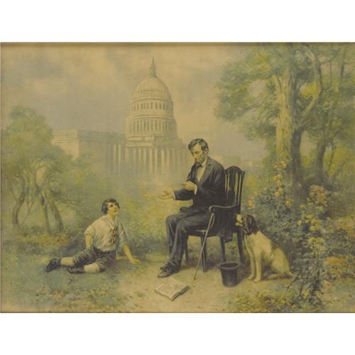 <B>Beautiful, Unusual Framed Color Print of Lincoln with Boy and Dog.</B></I> Measures 20.75" x 15.75", framed to an overall size of 22.75" x 17.75". Ready to hang. The foreground shows a bearded Lincoln in a Washington park, sitting in a high-back chair, seeming to lecture to a small child while a panting dog sits nearby. An open book, Lincoln's cane and top hat lie around them. The Capitol rotunda stands in the mist in the background. "2352" is printed in the bottom right corner, probably the sequential print number from the manufacturer. In the lower left corner is printed "© R.C. Co., N.Y.". Below that is signed "C.Y. Moran" followed by what appears to be a swastika (probably not Nazi-related). The print shows a small fold in the the top right corner and a few surface scratches, but they do not detract at all from this beautiful piece of Lincolniana.<BR><BR><b>Shipping:</b> Framed - with Glass, Medium (<a target="_blank" href="http://www.heritageauctions.com/common/shipping.php">view shipping information</a>)