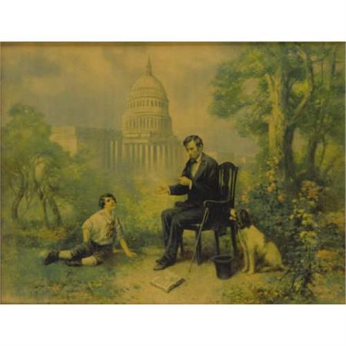 <B>Beautiful, Unusual Framed Color Print of Lincoln with Boy and Dog.</B></I> Measures 20.75" x 15.75", framed to an overall size of 22.75" x 17.75". Ready to hang. The foreground shows a bearded Lincoln in a Washington park, sitting in a high-back chair, seeming to lecture to a small child while a panting dog sits nearby. An open book, Lincoln's cane and top hat lie around them. The Capitol rotunda stands in the mist in the background. "2352" is printed in the bottom right corner, probably the sequential print number from the manufacturer. In the lower left corner is printed "© R.C. Co., N.Y.". Below that is signed "C.Y. Moran" followed by what appears to be a swastika (probably not Nazi-related). The print shows a small fold in the the top right corner and a few surface scratches, but they do not detract at all from this beautiful piece of Lincolniana.<BR><BR><b>Shipping:</b> Framed - with Glass, Medium (<a target="_blank" href="http://www.heritageauctions.com/common/shipping.php">view shipping information</a>)