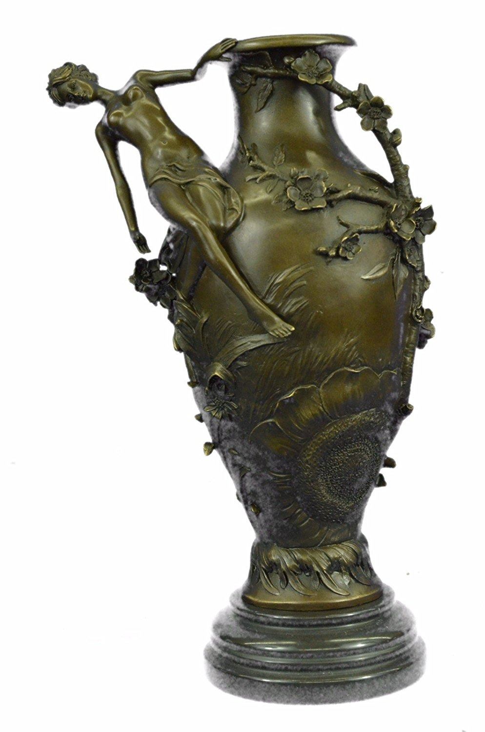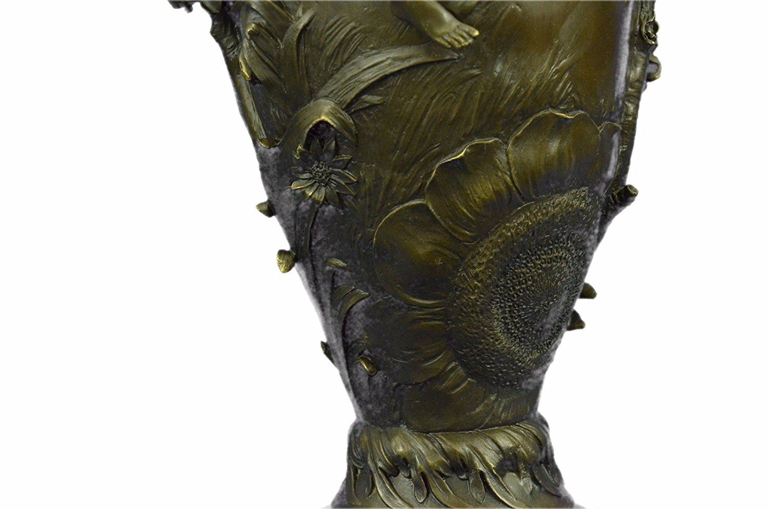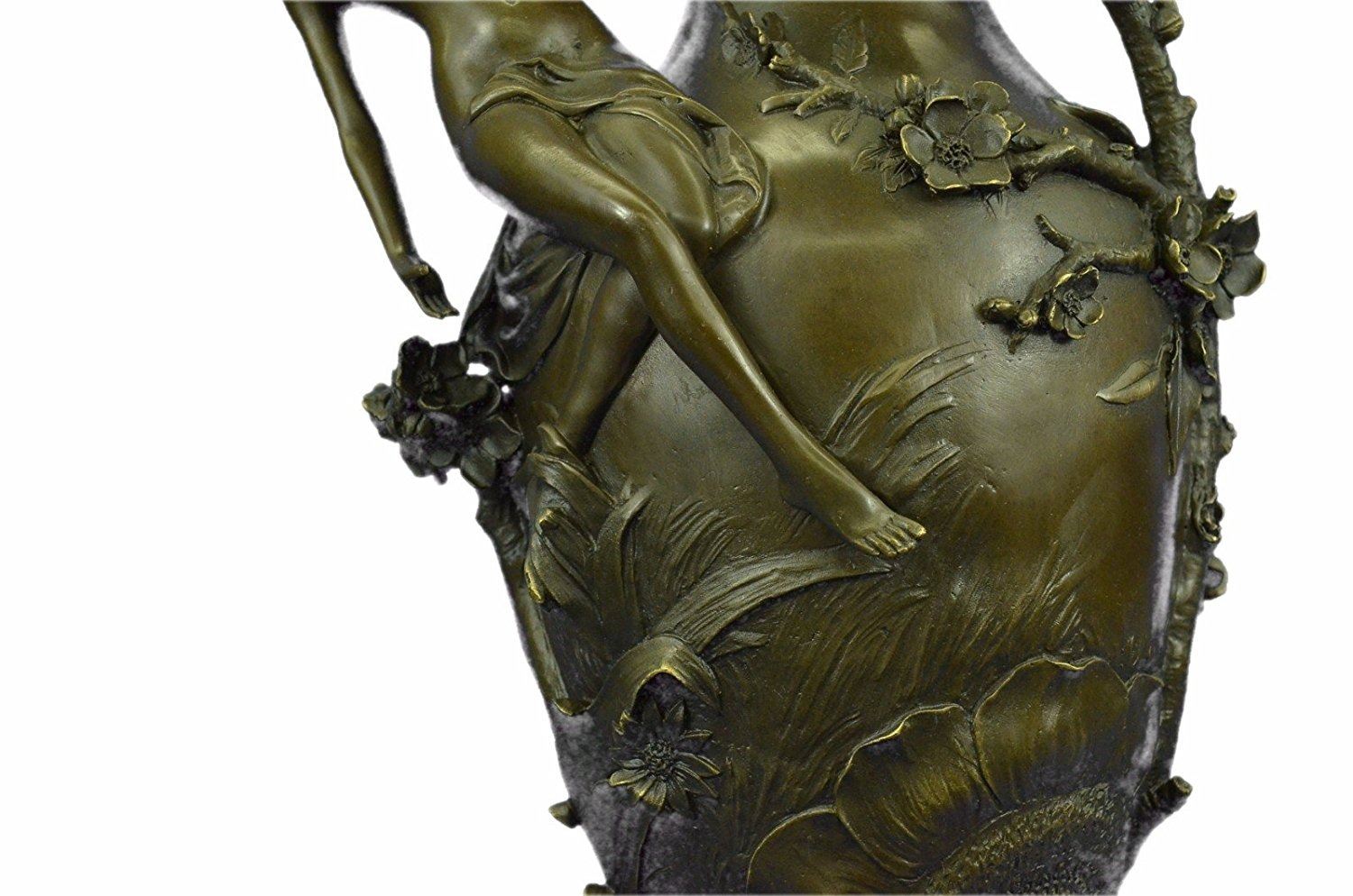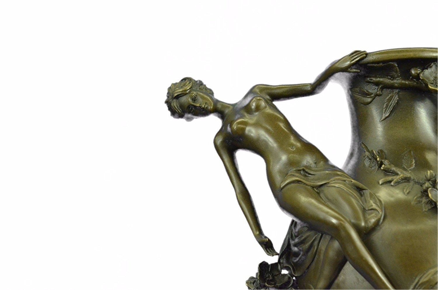 An exquisite vase that would be the center of attention in any room. A nude woman dangles off the edge, hovering over a field of flowers. She leans back, holding onto the edge. Vines and blossoming flowers spiral around the round vase. The beauty in the sculpture is in the detailing of the flowers that seem to pop out. This unique piece can act as a flower pot or just an eye-catching addition to your abode. 100% bronze and handmade, this brown patina sculpture was cast using the Lost Wax Method and mounted on a marble base. Bronze Dimensions with Marble Base: Height 16 X Width 10 inches. Weight: 15 LBS. Inventory: 32-B66910023