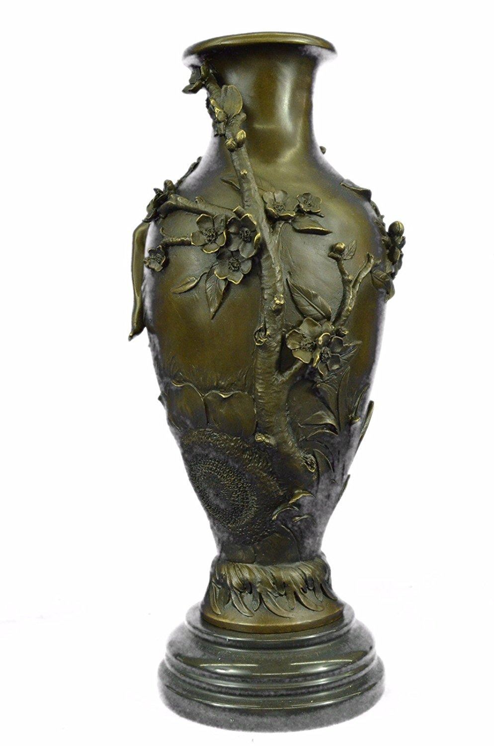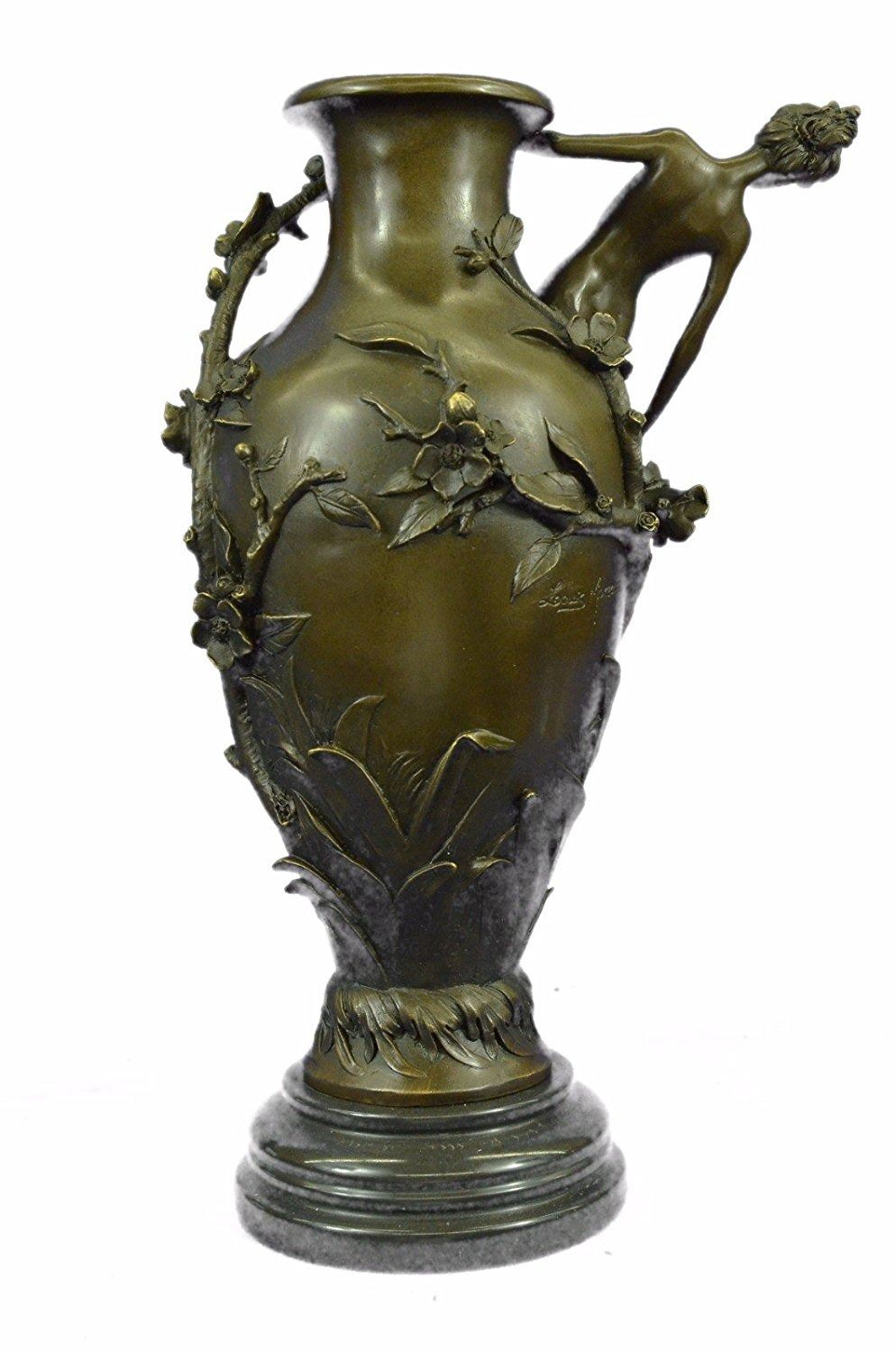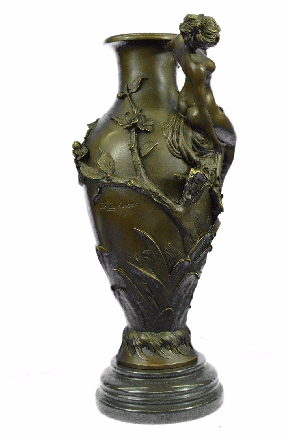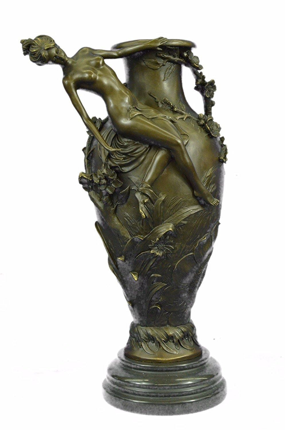 An exquisite vase that would be the center of attention in any room. A nude woman dangles off the edge, hovering over a field of flowers. She leans back, holding onto the edge. Vines and blossoming flowers spiral around the round vase. The beauty in the sculpture is in the detailing of the flowers that seem to pop out. This unique piece can act as a flower pot or just an eye-catching addition to your abode. 100% bronze and handmade, this brown patina sculpture was cast using the Lost Wax Method and mounted on a marble base. Bronze Dimensions with Marble Base: Height 16 X Width 10 inches. Weight: 15 LBS. Inventory: 32-B66910023