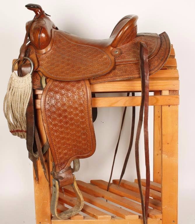 Made in Great Falls, MT. Brown leather with a stamped floral design. Maker marked twice. 14" seat in overall good condition.