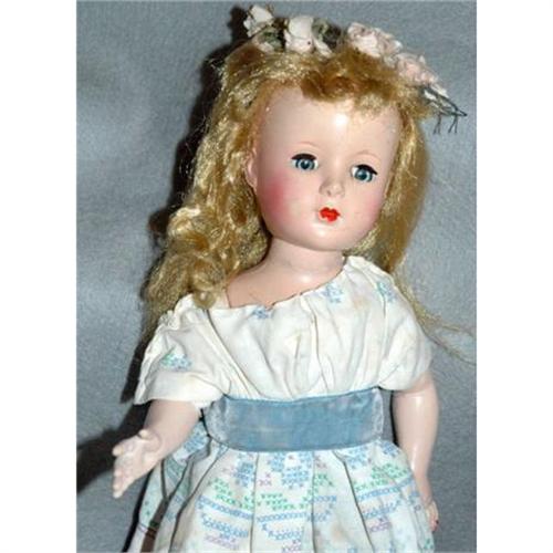 Lovely Old Hard Plastic Doll. She is 14" tall, completely strung and jointed, sleep eyes and painted fingernails. Her arms, legs and head can be rotated and moved several directions because the joints are rouned. <p> She is only maked on the back "made in U.S.A." <p> Her condition good.