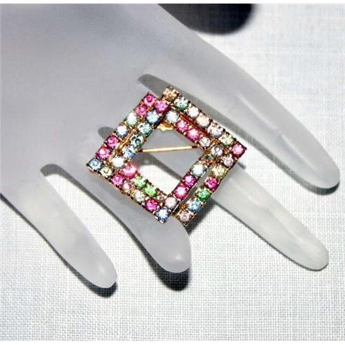 Very pretty and well executed is this Art Deco style vintage interlocking square Pin or Brooch. Hand set in prongs are sparkling Rhinestones in wonderful Spring time pastel colors. Made in a wonderful gold plated metal with all original findings, this well made Pin measures 1 inch wide by 1 inches long.