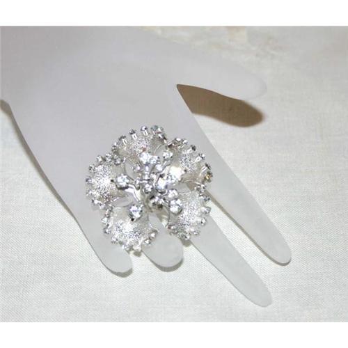 This gorgeous 1940s Rhodium plated Vintage Rhinestone Floral Brooch or Pin is all about sparkle! Because of the composition and Diamond Cut Rhinestones, no matter which way you turn there is sparkle! Five pedals, each outlined with 8 small Diamond Cut White Rhinestones, with one larger Rhinestone in the center bottom. The center of this Floral Brooch or Pin is an explosion of Sparkling Rhinestones depicting the center of a flower. Measuring 2 inches in diameter: simply gorgeous! Attaching with the original C clasp closure with safety. This Beautiful Vintage Diamond Cut White Rhinestone Flower Pin is in superb condition.