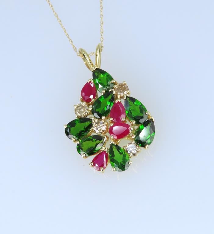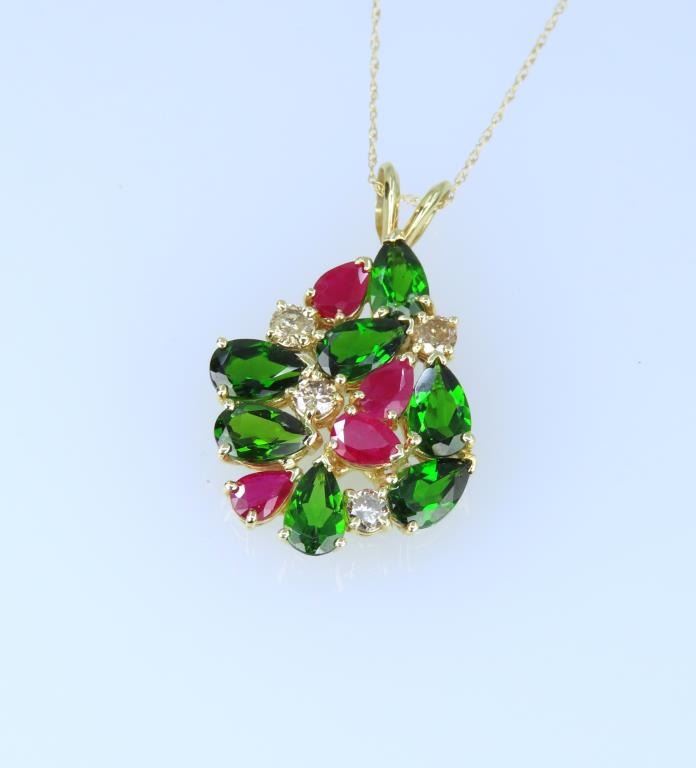 and Diamond Pendant, featuring 15 pear shaped richly colored Green Tourmalines and Rubies accented with 4 round cut Diamonds with a combined gem weight of approx. 10.00 carats set in a stylish 14 karat yellow gold setting. Retail $6,000-$9,000.