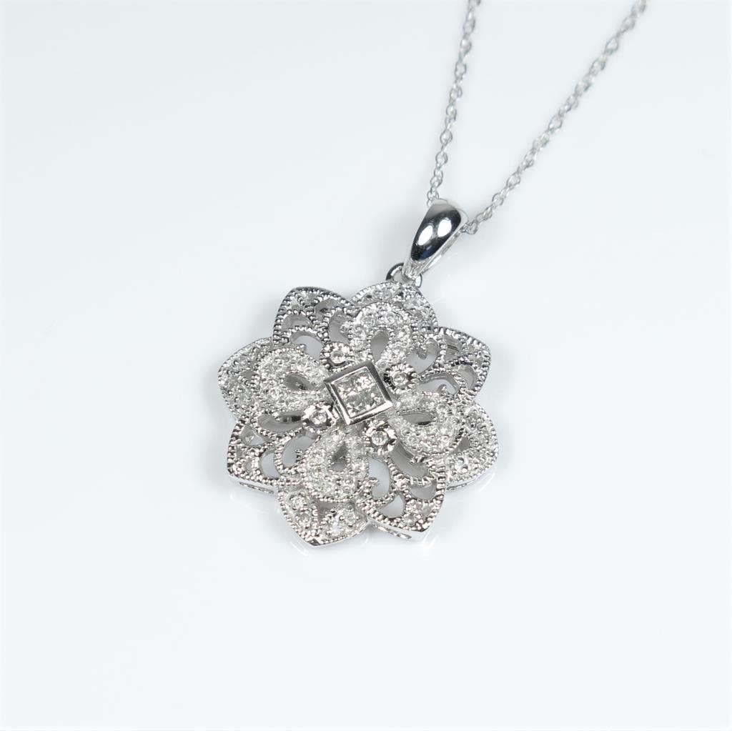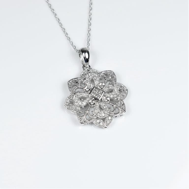Beautiful Vintage style Diamond Pendant featuring 4 Princess cut Diamonds accented with 40 micro set Diamonds weighing approx. 0.50 carats with G-H colors and SI clarity set in highly detailed flower design craftedin 14 karat white gold. Retail $2,000-$3,000 Estimates $1,000-$1,500