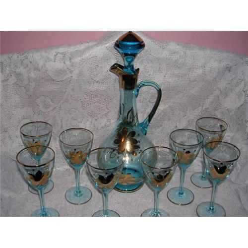 This is a gorgeous set to display and use for when you entertain those special guests. The decanter is approx 15" high including the solid heavy stopper. It is a sapphire blue color with bold gold flowers and wide gold trim. It comes with 8 matching long stem goblets. The gold is 90% -100% intact throughout the entire set. Two of the goblets still have the paper sticker label which reads "Made in Romania."