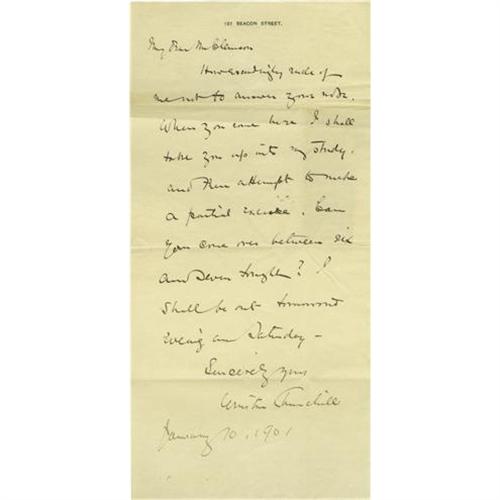<B>Beautiful Winston Churchill Autograph Letter Signed.</B></I> One page, 5.5" x 11", 181 Beacon Street letterhead, England, January 10, 1901. In full: "<I>My Dear Mr. Clemson, How exceedingly rude of me not to answer your work. When you come here I shall take you up into my study and then attempt to make a partial excuse. Can you come over between six and seven tonight? I shall be out tomorrow evening and Saturday- Sincerely Yours Winston Churchill January 10, 1901</B></I>" Churchill had just arrived back from the United States on a prolonged speaking engagement, One month later, in February, Churchill entered Parliament and became associated with a group of Tory dissidents led by Lord Hugh Cecil and referred to as the Hughligans, a play on "Hooligans". During his first parliamentary session, Churchill provoked controversy by opposing the government's army estimates, arguing against extravagant military expenditure. A very nice early Churchill item. Very fine.1 <BR><BR><B>Condition Report:</B>