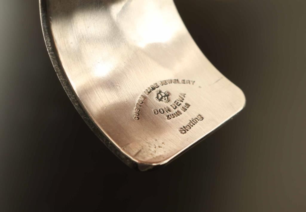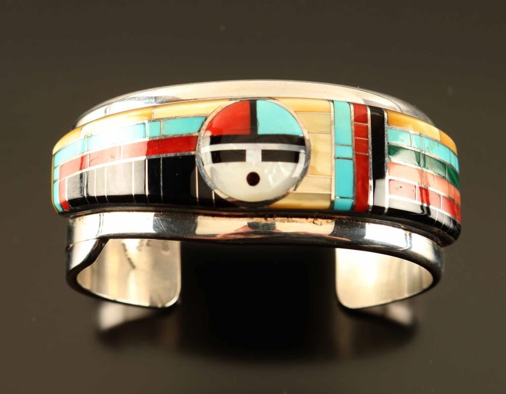 Inlaid with turquoise, onyx, malachite, coral, and mother pearl with sunface design. Signed Don Dewa set in sterling silver.