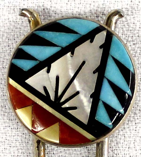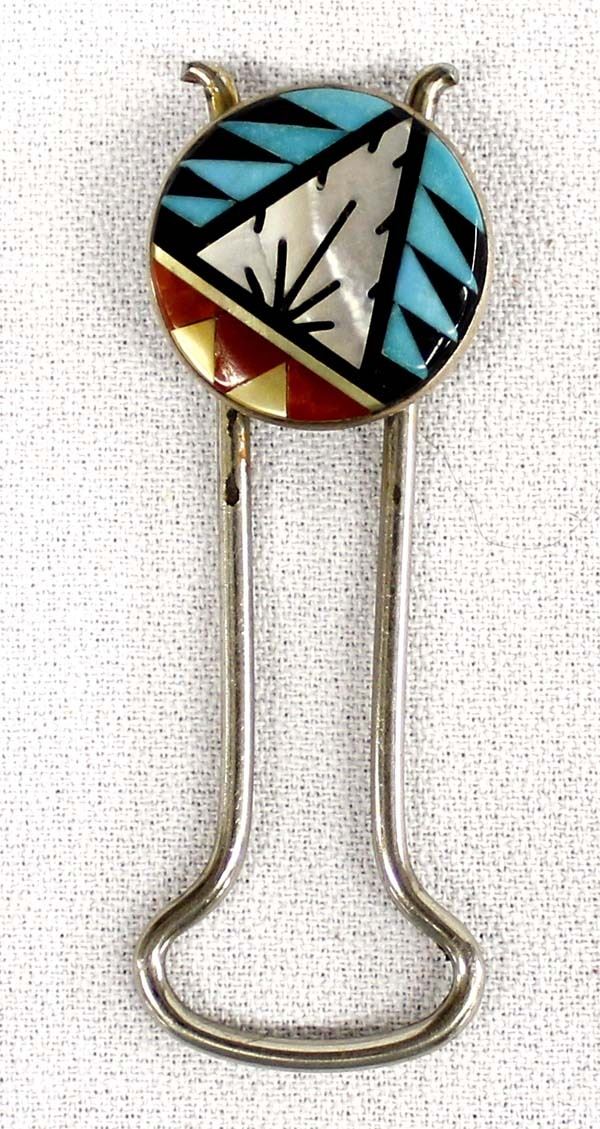 Beautiful Native American Zuni Sterling Inlay Key Ring by Marlene Booqua, the inlay piece measures 1''D, the entire piece measures 3''L, hallmarked
