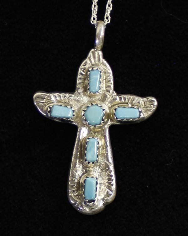 Beautiful Native American Zuni Sterling Turquoise Cross Pendant Necklace by Cecilia Iule, sterling chain measures 22''L end to end and cross pendant measures 1.75''L x 1.25''W, hallmarked C. Iule