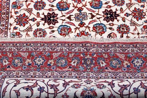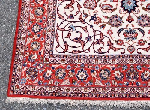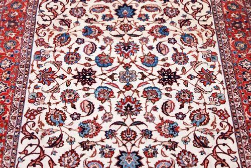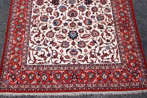 Beautiful allover floral design Semi-Antique Persian Najafabad. Made of fine quality lamb's wool pile on cotton foundation, all natural vegetable dye, incorporatinga finely detailed allover floral pattern on a cream colored background and contrasted beautifully by an intricately done floral border. Hand woven in Najfabad, Iran. Size 10 feet 2 inches X 6 feet 9 inches.