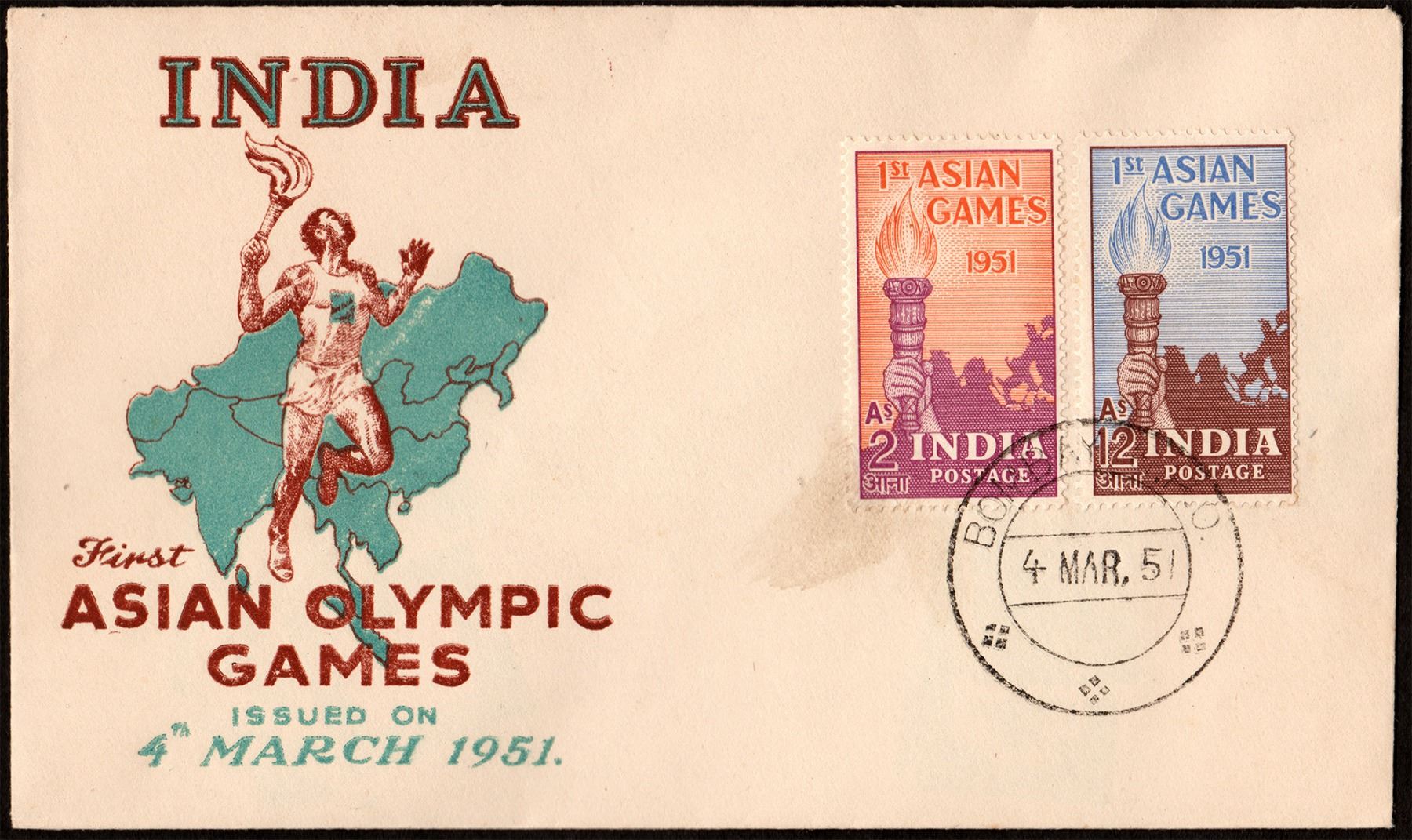 Private Cover, 1951, 2 Annas and 12 Annas stamps of "1st Asian Games" affixed on the front and cancelled with round dispatch seal as “BOMBAY G.P.O. | 4 MAR. 51”, issued for commemorating Asian Olympic Games hosted by India for the first time, there is a beautiful image of Asia map and a sportsman with a fire torch in the front, with text “INDIA | First | ASIAN OLYMPIC | GAMES | ISSUED ON | 4th MARCH 1951”, good condition, Rare.