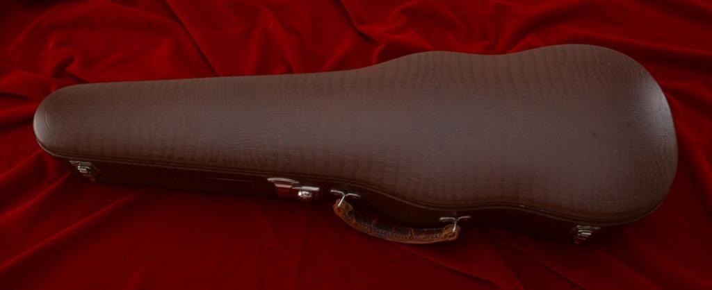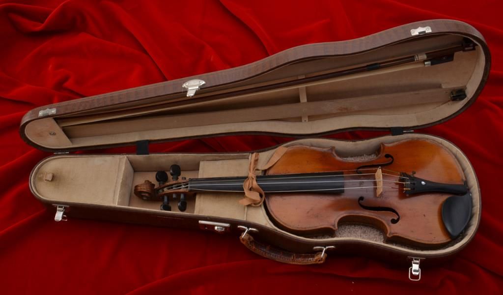 Beautiful antique violin in lined case with bow, extra wooden bridge and boxed block of rosin. Violin has maple back and sides with spruce top and mother of pearl inlay on anchor below bridge; overall good condition and a copy of the famous Stradivarius. The case is in overall very good condition, English-made with faux alligator skin covering. Est.: $150-$300.