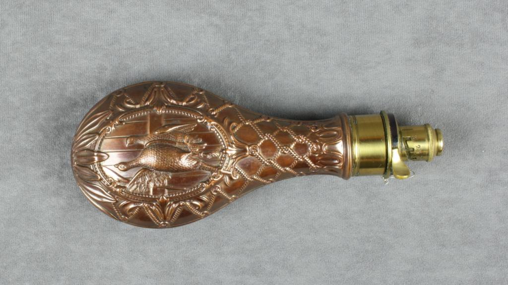Beautiful brass powder flask with intertwined rope and hanging game design with brass spout in excellent condition. Est.: $150-$300.