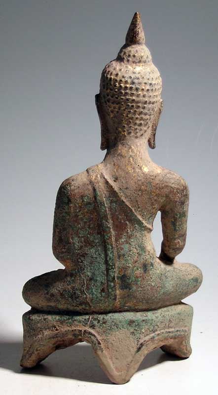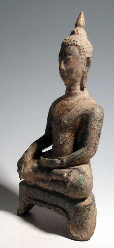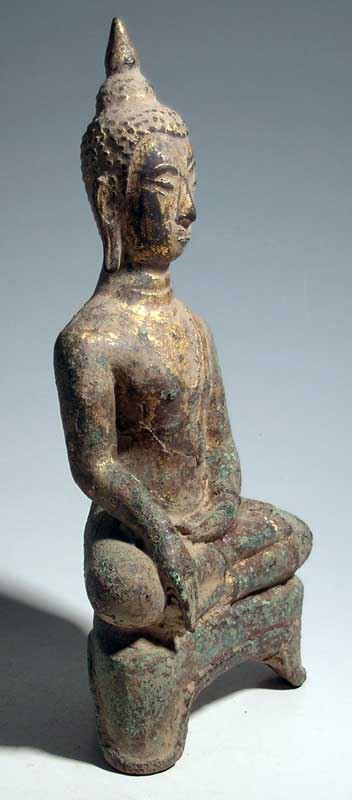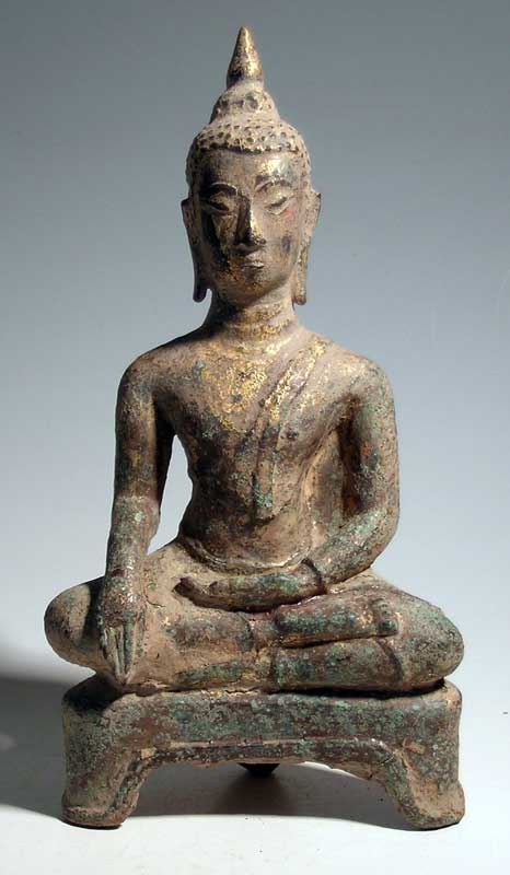 A beautiful bronze Buddha figure from Thailand, c. 14th - 15th century. This lovely Sukhothai period figurine depicts Buddha seated on a three-legged base, wearing a flame-shaped aureole, finely curled hair, a slight smile, broad shoulders and an oval face. Much of the thin gold layer remains. H: 8 1/2 in (21.6cm). In excellent condition, with strong mineral deposits. Ex Devenyi collection.