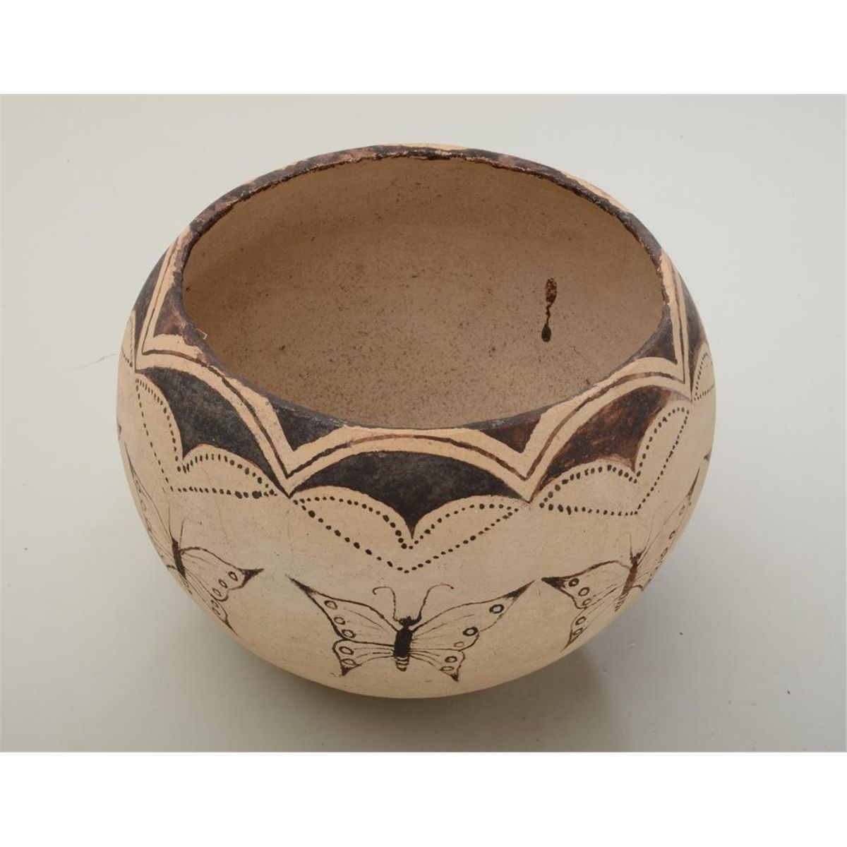 Beautiful butterfly painted pot approx. 7” in height by approx. 9” in diameter in overall very good condition with repeating butterfly images around bowl and nicely decorated rim. Est.: $250-$500.