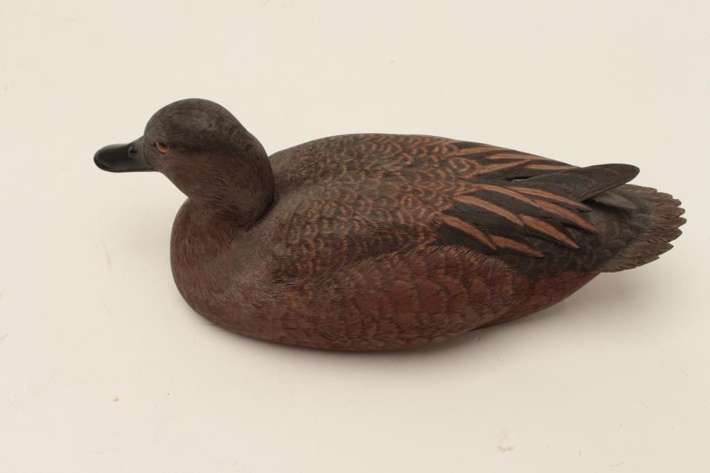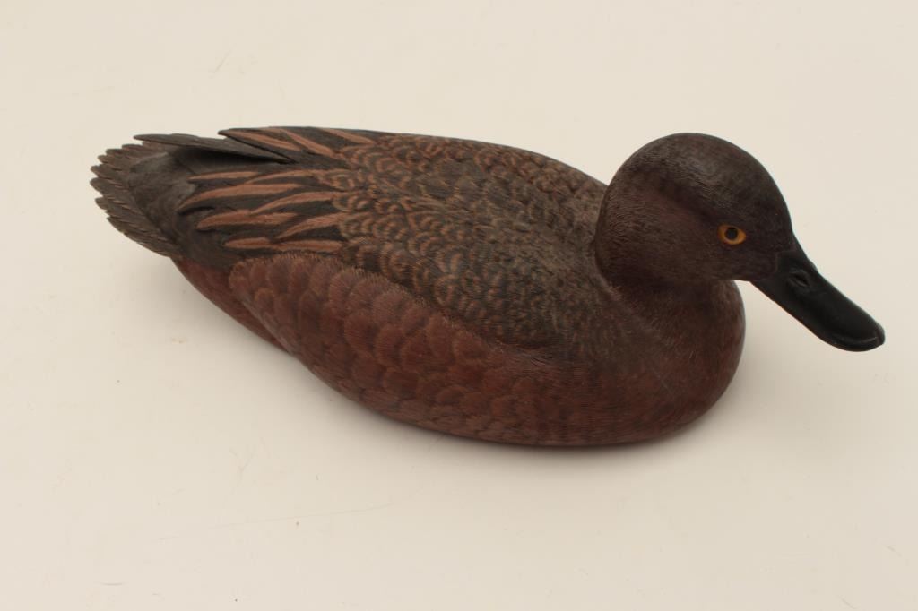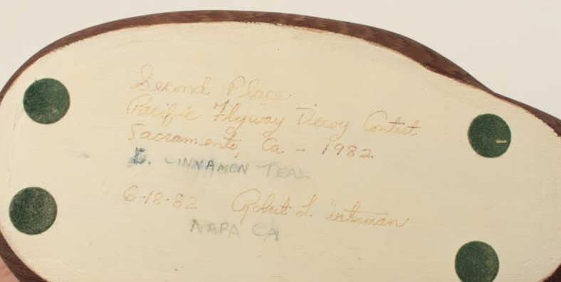 Beautiful cinnamon teal duck decoy, carved and signed by Robert L. Waterman; finely accomplished; won second place in Pacific Flyway Decoy Contest, Sacramento, Ca., 1982. Est.: $500-$1,000.
