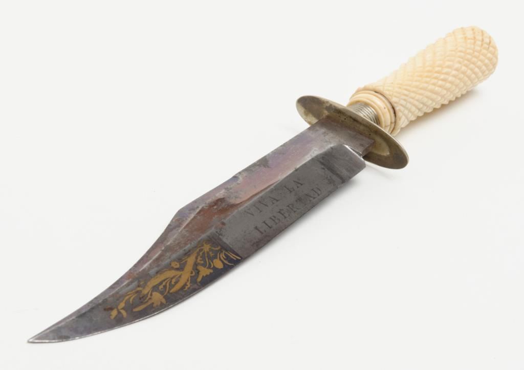 Beautiful clip point Sheffield style knife accompanied by a leather sheath with metal tip and throat with belt clip; the knife is approx. 12” overall with a 7” blade that is etched “VIVA LA LIBERTAD” and in very good to near fine conditionshowing considerable original polish, the majority of its word and floral etching and several spots of scattered erosion; simple cross guard and beautiful mellow checkered ivory or bone substantial grip. The sheath is overall good tovery good with some losses to the lower edge; a very desirable clip point with correct sheath. Est.: $1,500-$3,000.