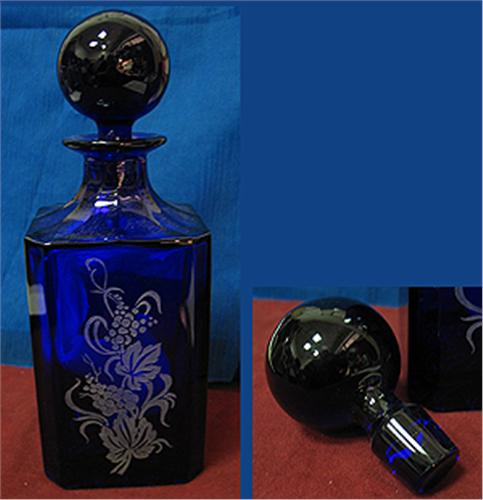Beautiful cobalt blue deeply etched decanter standing 10" tall. No chips or cracks weighs 3.72lbs, unsigned