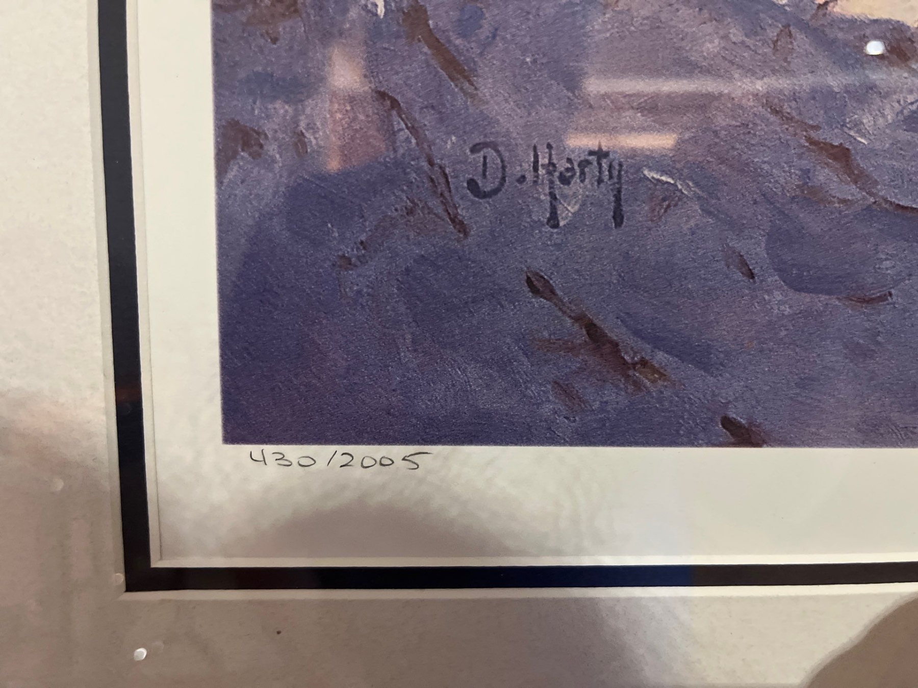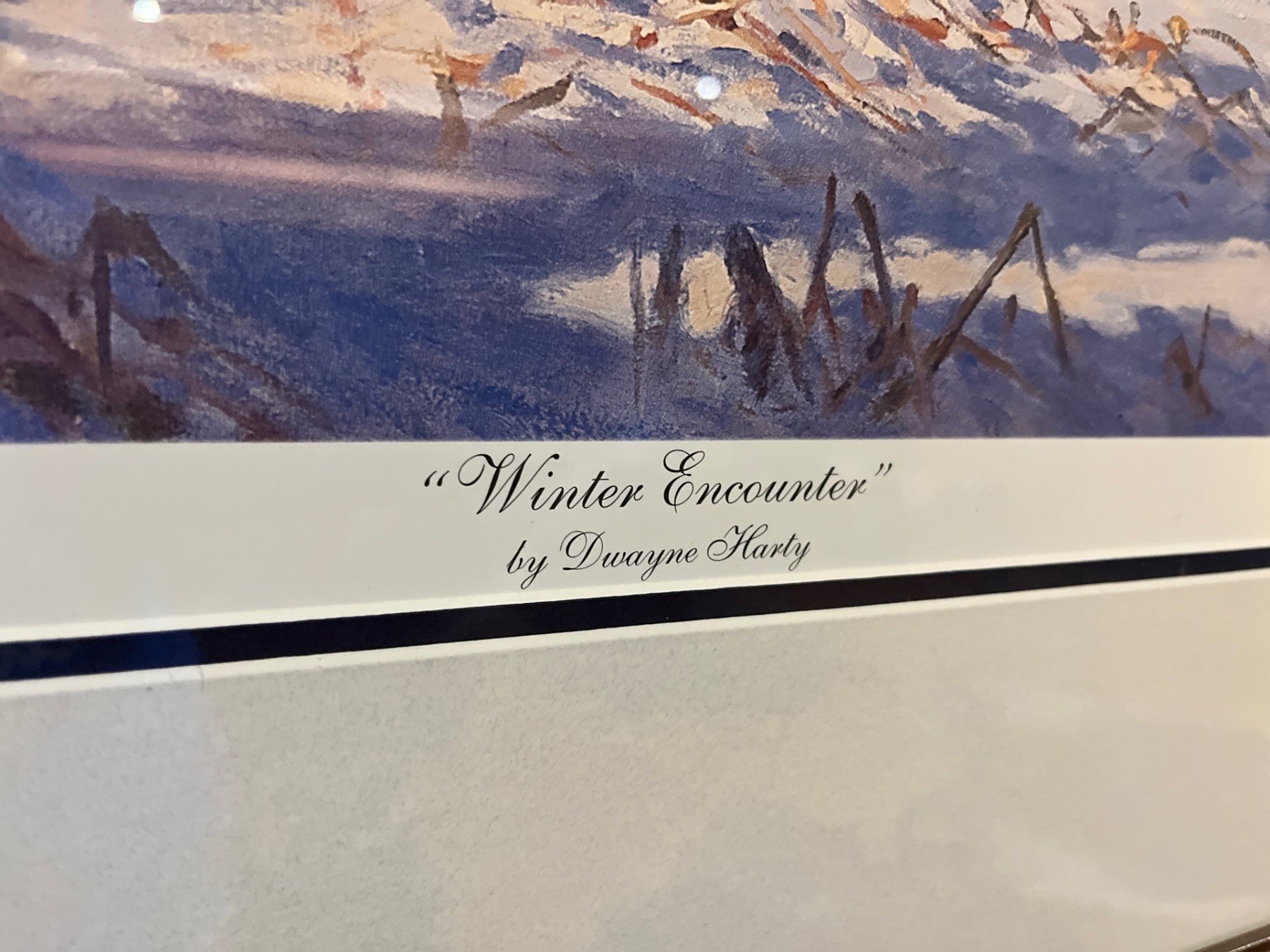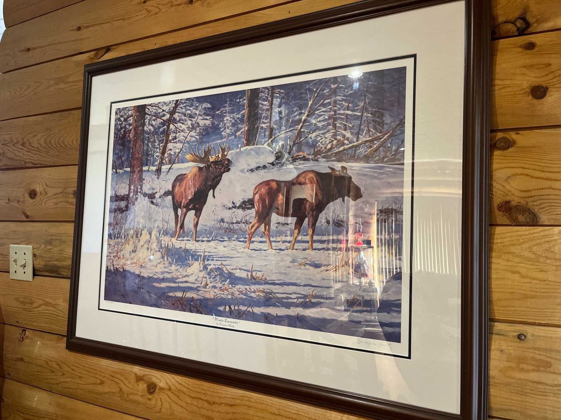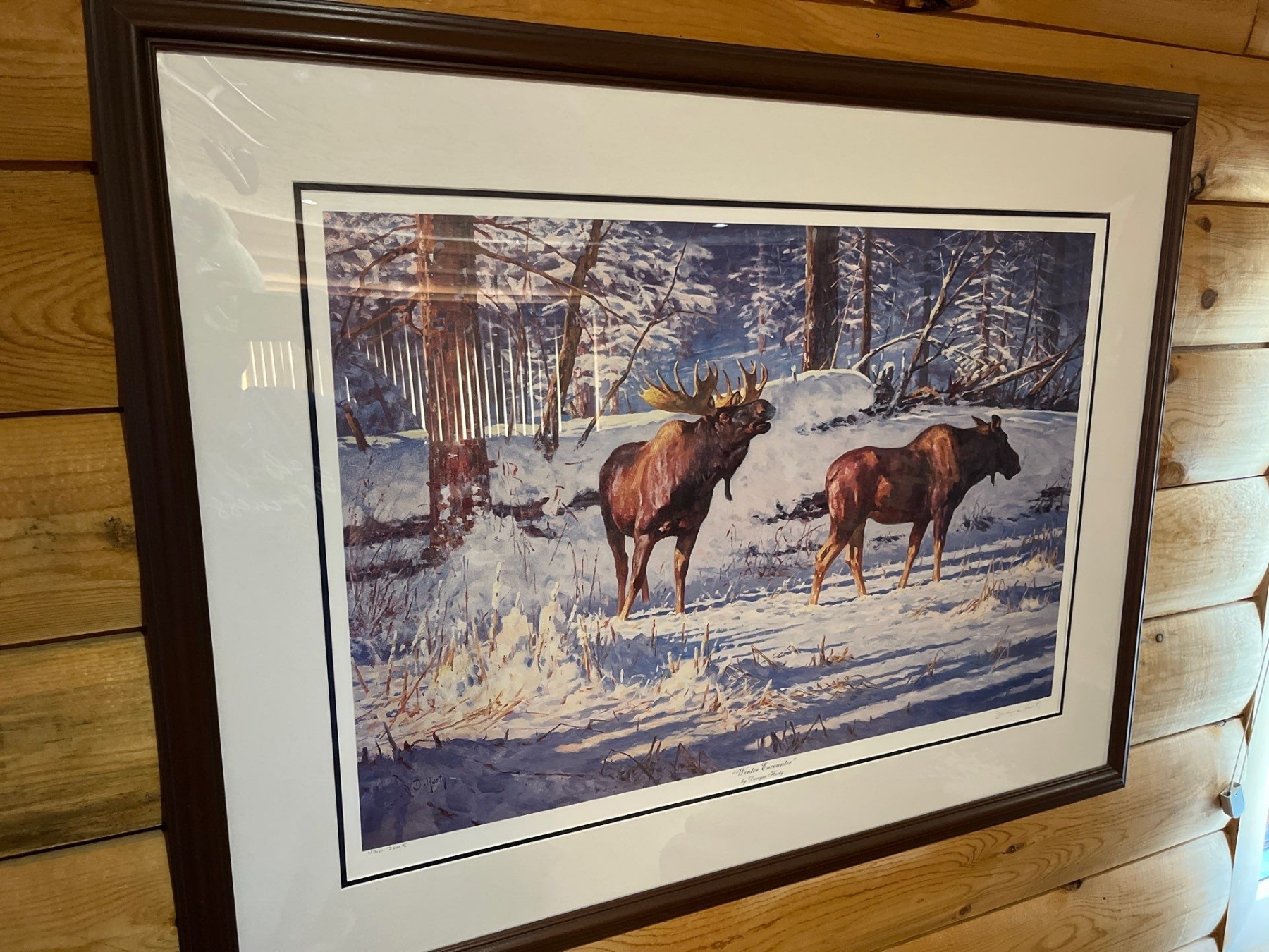 Beautiful cow and bull moose, print, “Winter Encounter “ framed and matted by Dwayne Hardy 42” wide 31” height