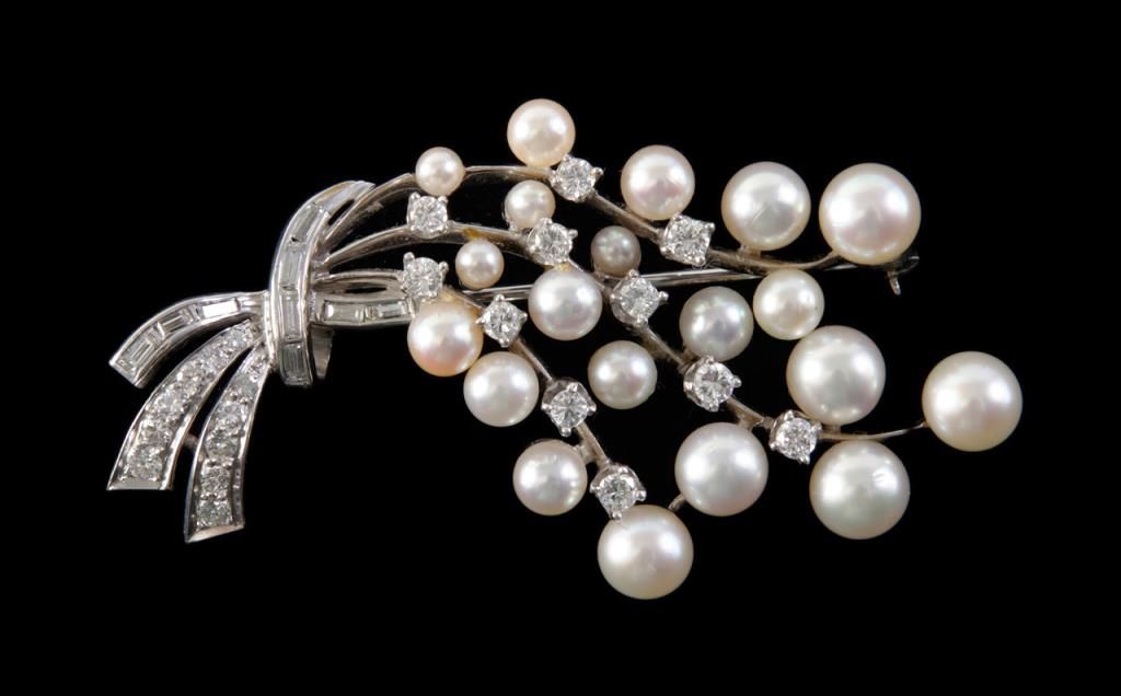 Beautiful custom antique Broach set with Pearls and Diamonds. 14k white gold. Est. retail replacement $3,000-$4000