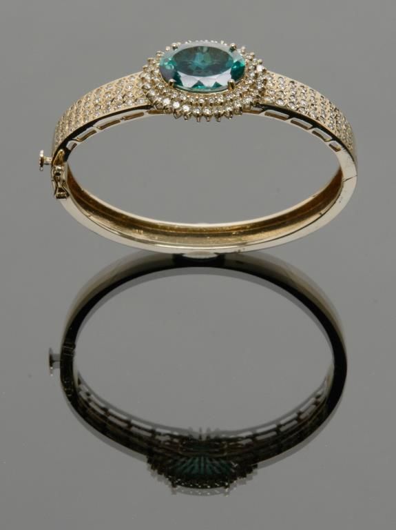 Beautiful custom made bright green Brazilian oval shaped Topaz surrounded by 3 CT to 5 CT of diamonds mounted in 14K gold bracelet in a vintage design. A stunning and unusual piece worthy of a collector. Est.: $3000-$6000